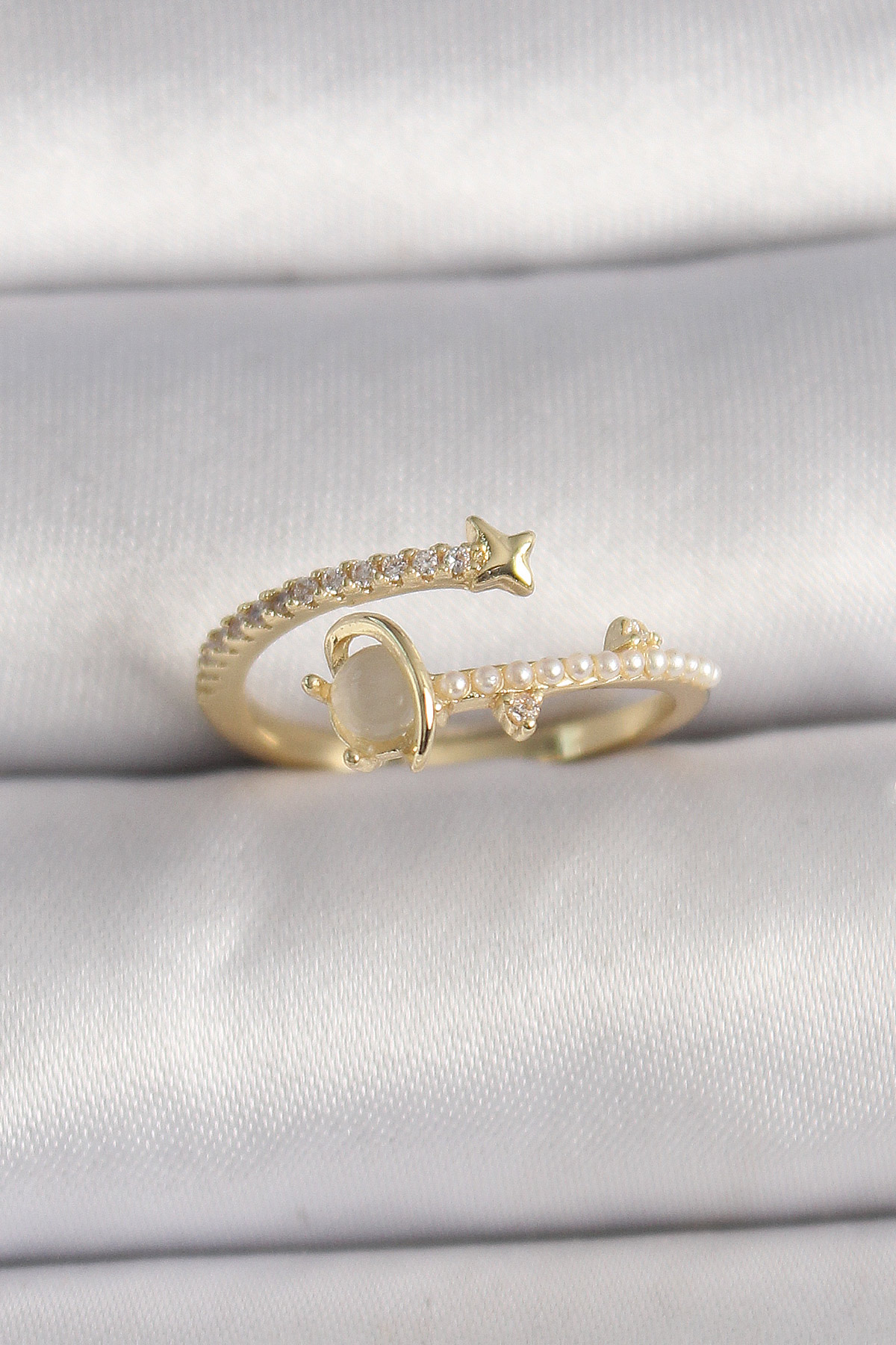 Pirinç Gold Renk Zirkon Taşlı Beyaz Mineli Yıldız Detaylı Ayarlanabilir Kadın Yüzük