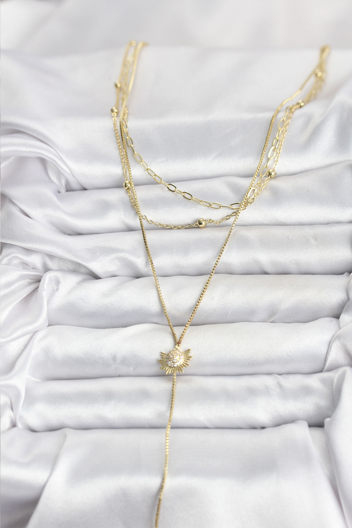 Pirinç Gold Renk Zirkon Taşlı Güneş Model Detaylı 3’lü Kombin Y Kadın Kolye