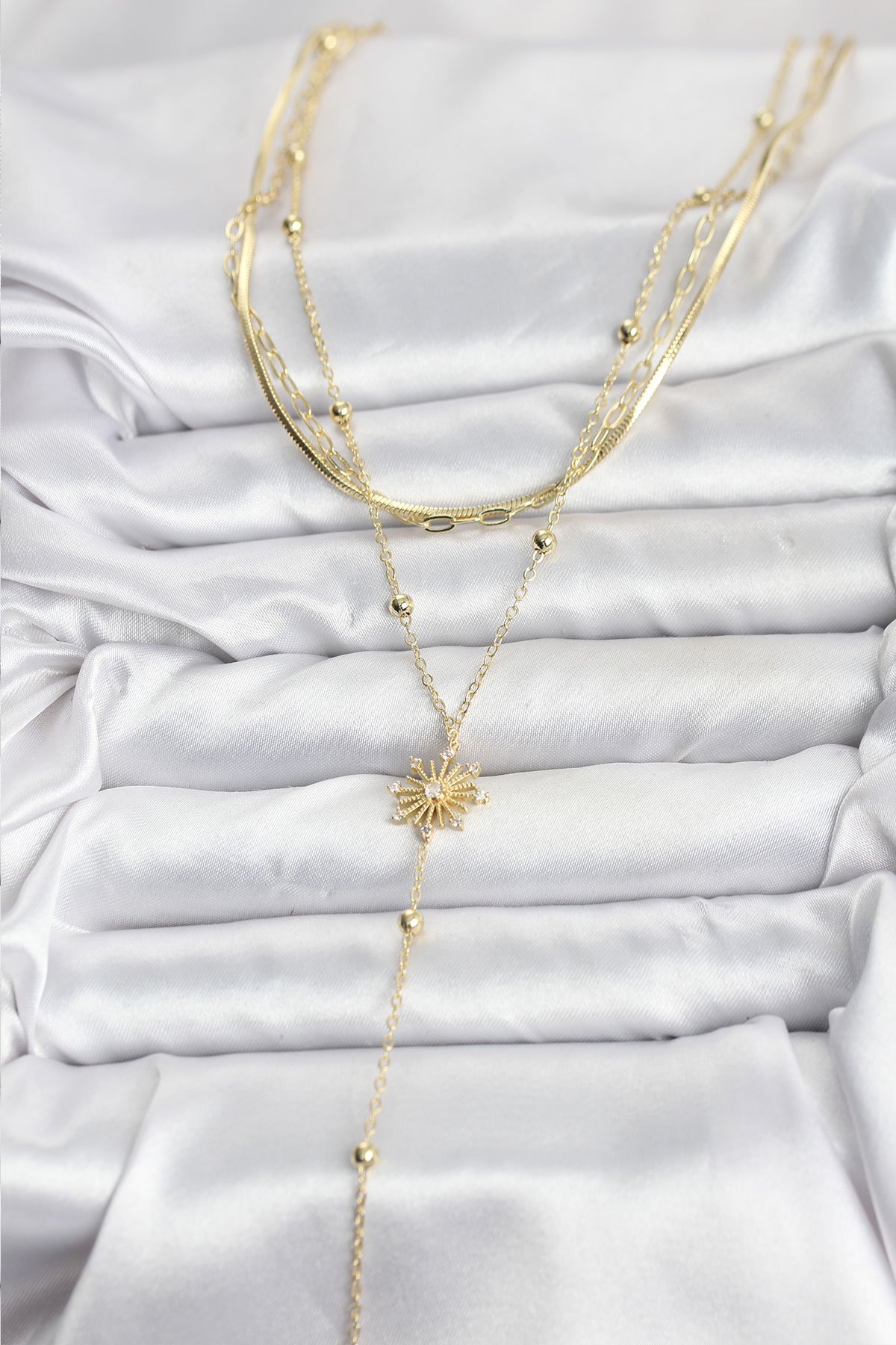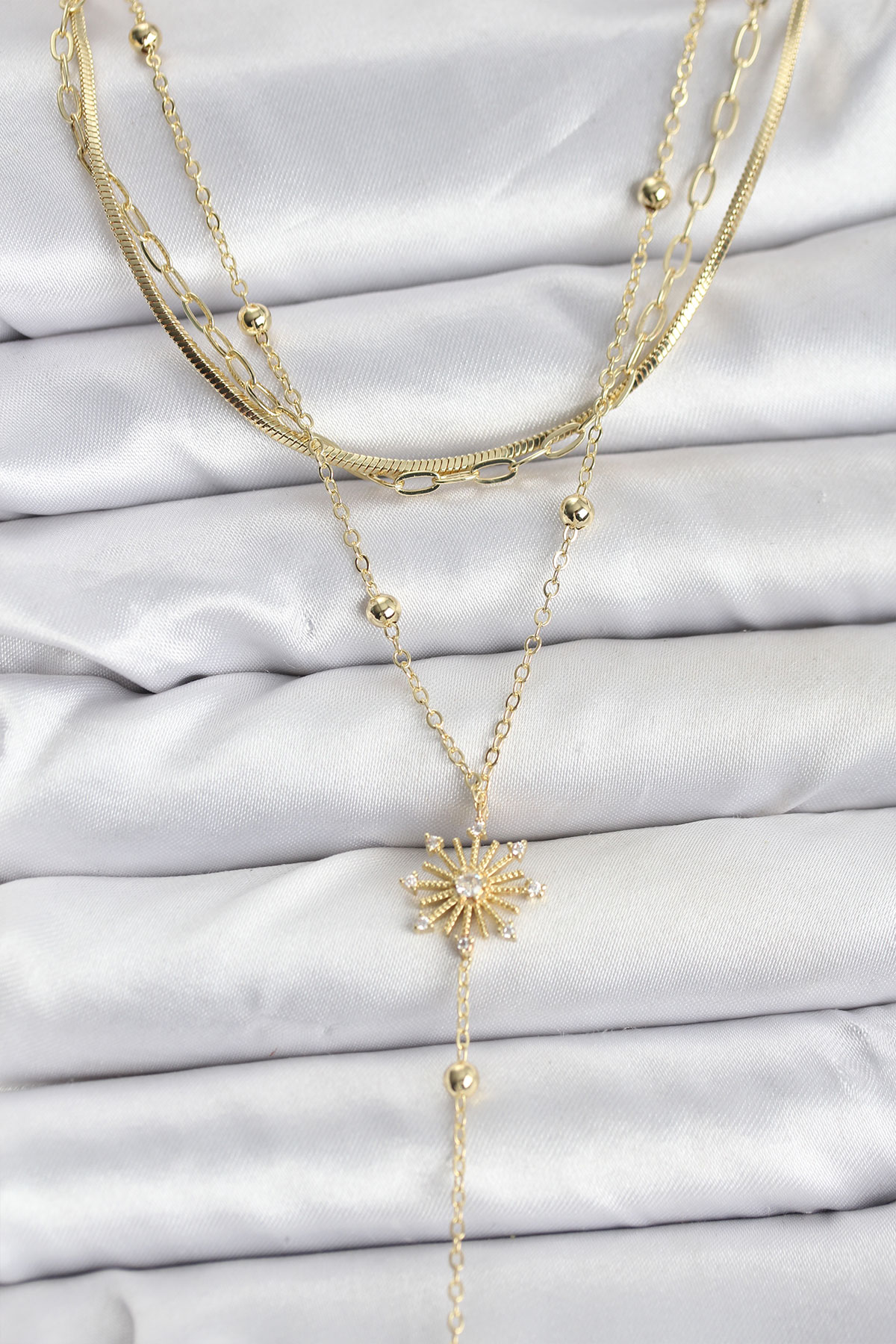Pirinç Gold Renk Zirkon Taşlı Model Detaylı 3’lü Kombin Y Kadın Kolye
