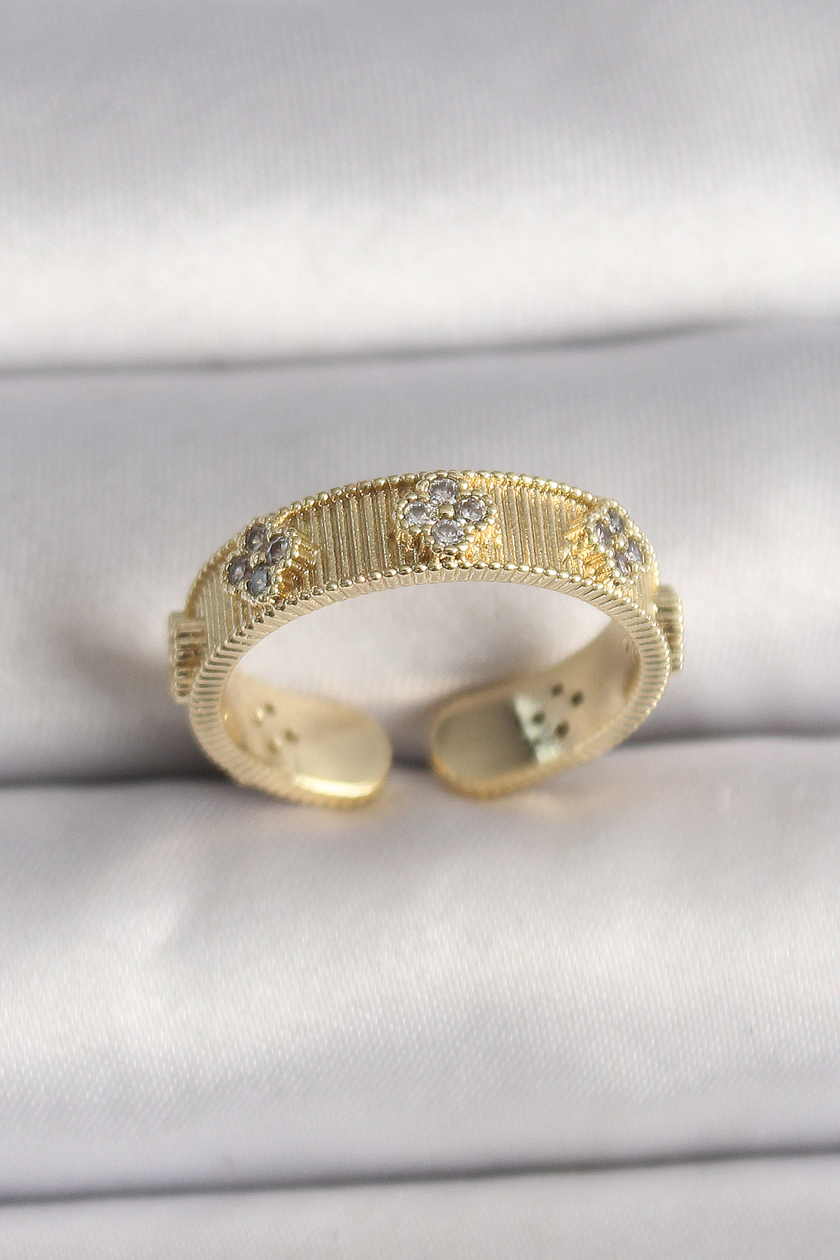 Pirinç Gold Renk Zirkon Taşlı Yonca İşlemeli Ayarlanabilir Yüzük