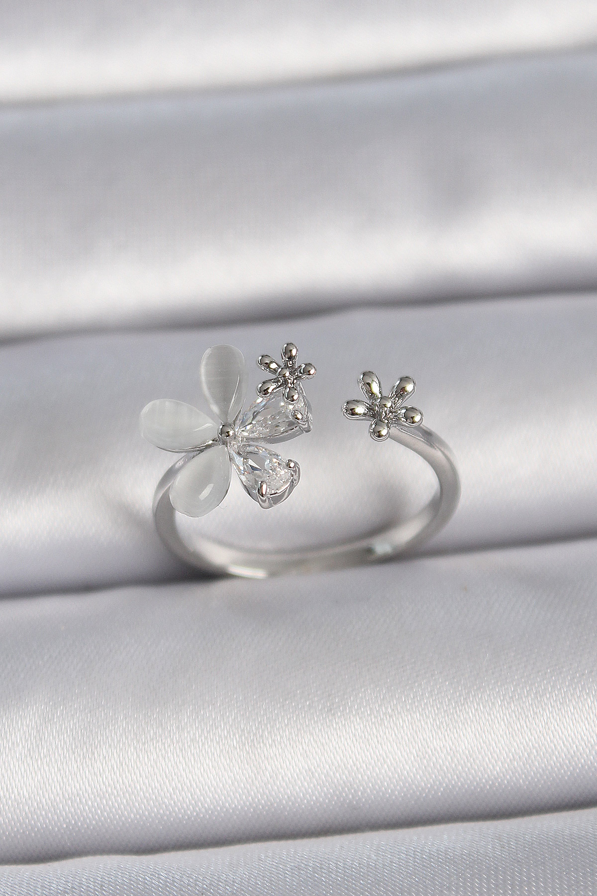 Pirinç Gümüş Renk Ayarlanabilir Zirkon Taşlı Beyaz Mineli Yaprak Model Kadın Yüzük