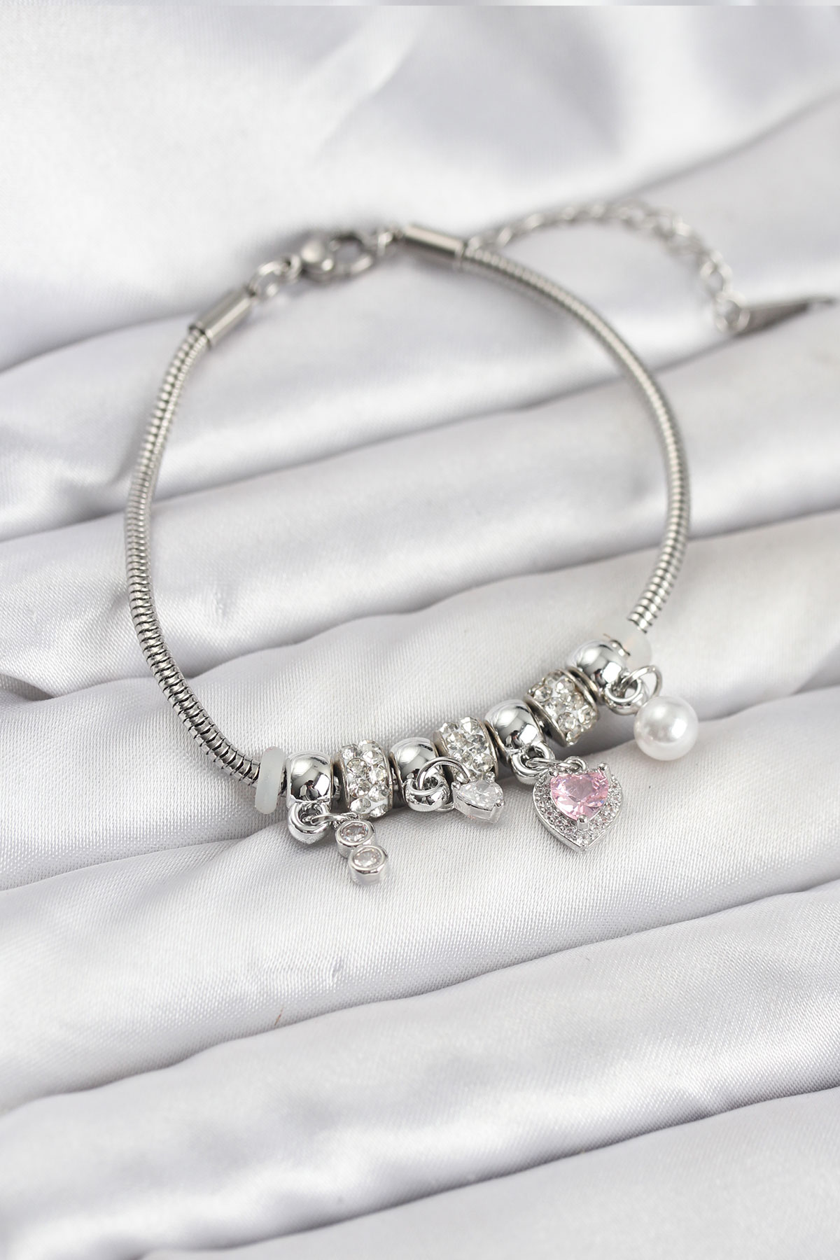 Pirinç Gümüş Renk Pembe Kalp Charmlı Kadın Bileklik