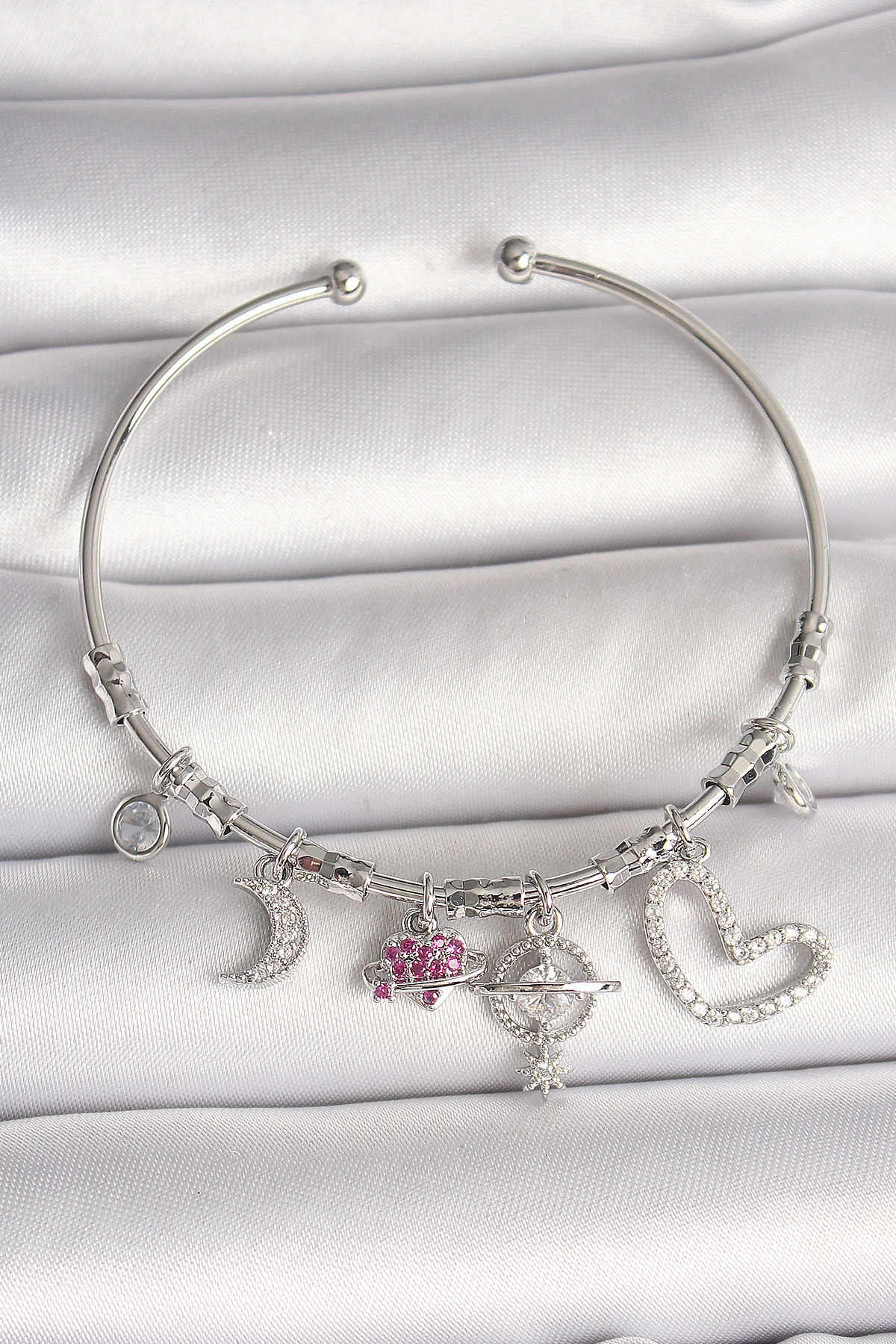 Pirinç Gümüş Renk Sallantı Zirkon Taşlı Gezegen Figür Kalp Detay Charm Kadın Bileklik