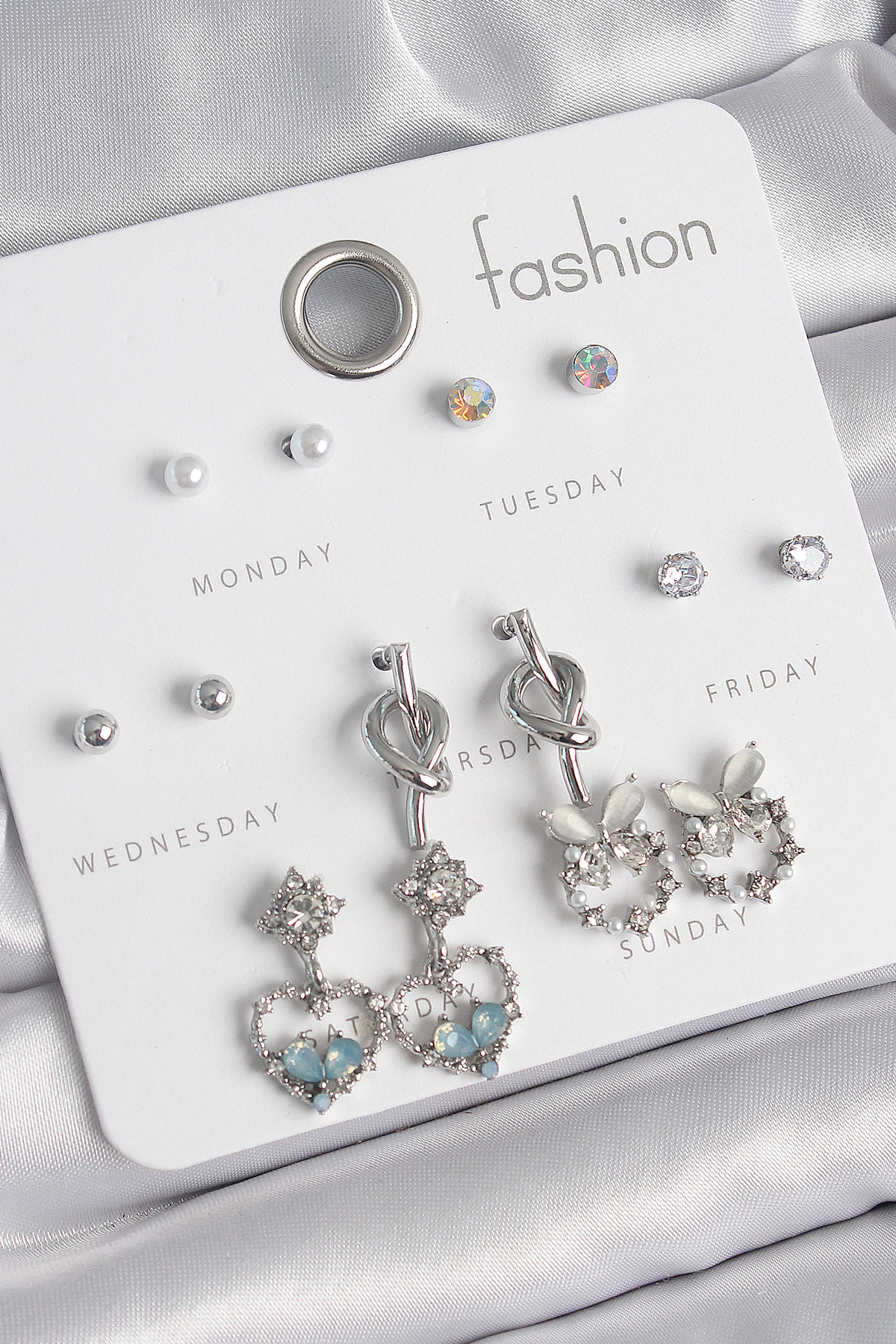 Pirinç Gümüş Renk Sallantı Zirkon Taşlı Kalp Model Düğüm Detay 7 Çift Kadın Küpe Seti