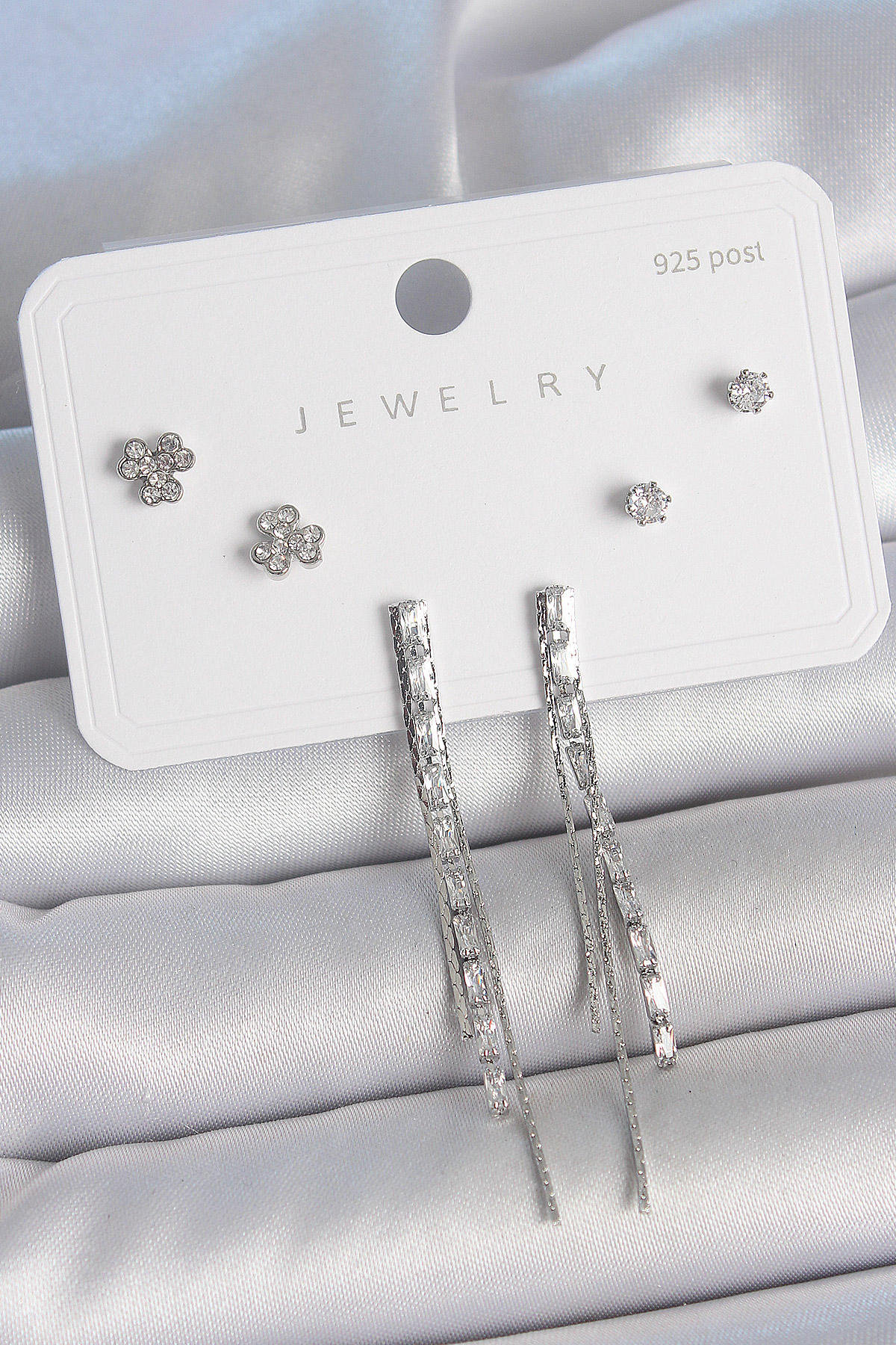 Pirinç Gümüş Renk Su Yolu Zirkon Taşlı Sallantı Model Çiçek Detay 925 Ayar Gümüş Çivi Kadın Küpe Seti