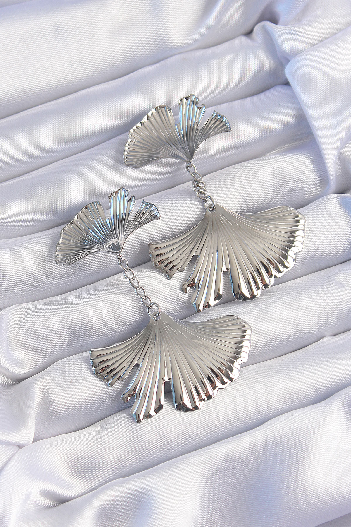 Pirinç Gümüş Renk Tırtıklı Yaprak Model Sallantılı Küpe