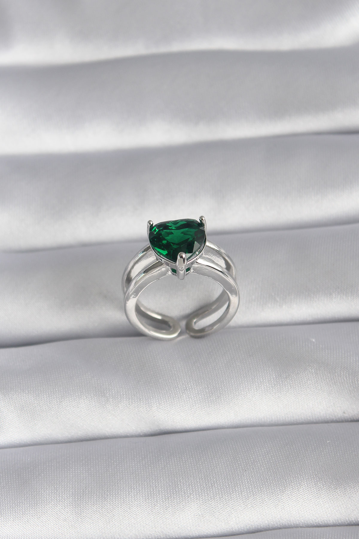 Pirinç Gümüş Renk Yeşil Zirkon Taşlı Tek Taş Model Kadın Yüzük