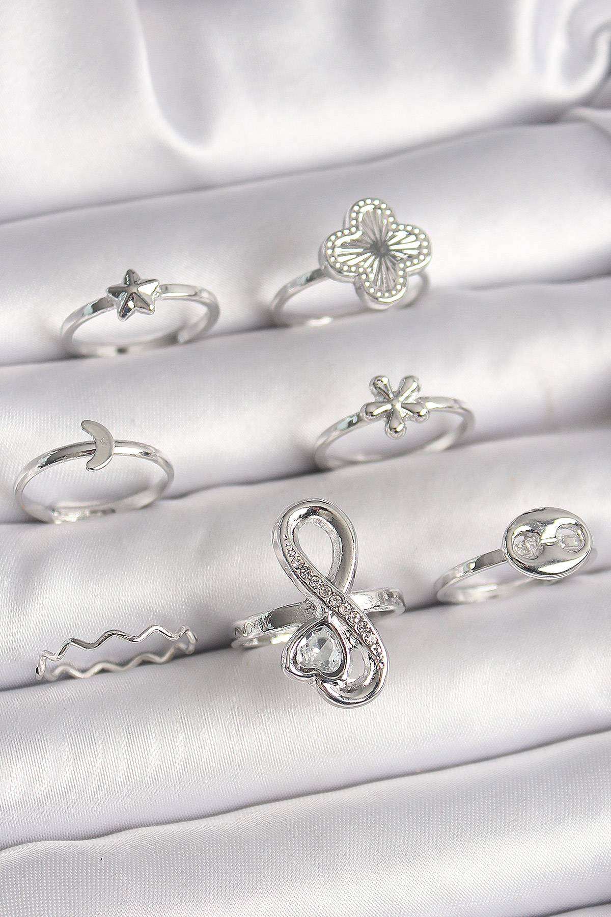 Pirinç Gümüş Renk Yonca Figür Sonsuzluk Zirkon Taşlı Kalp Detay Kadın Yüzük Kombini
