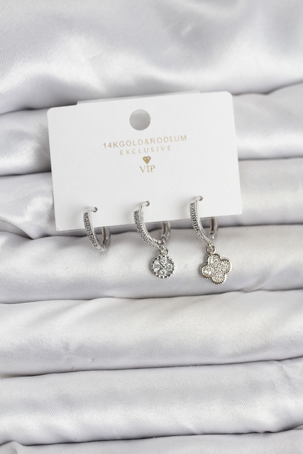 Pirinç Gümüş Renk Yonca Model 3’lü Kadın Küpe Seti