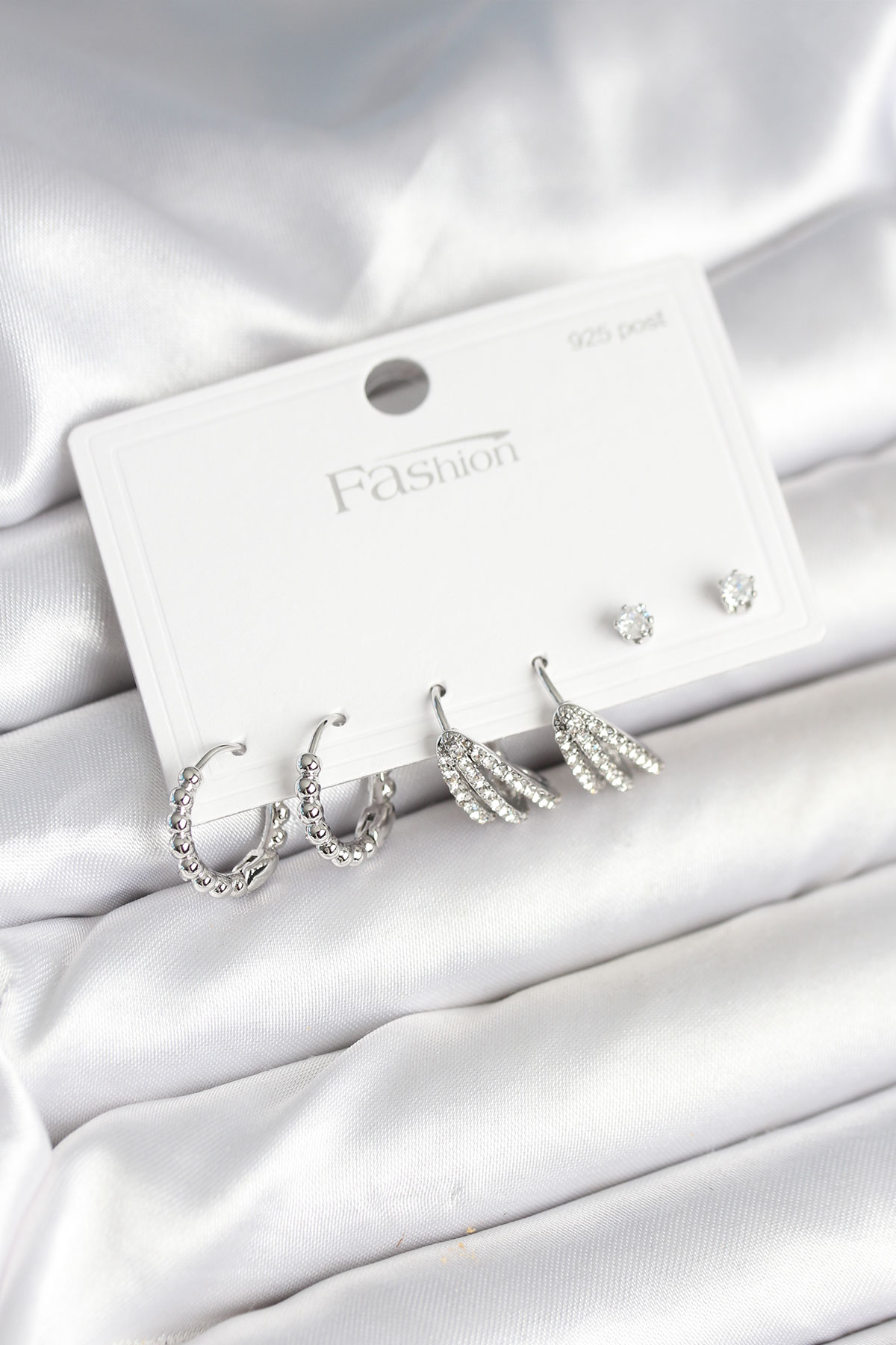 Pirinç Gümüş Renk Zirkon Taşlı 925 Gümüş Çivili Kadın Küpe Seti