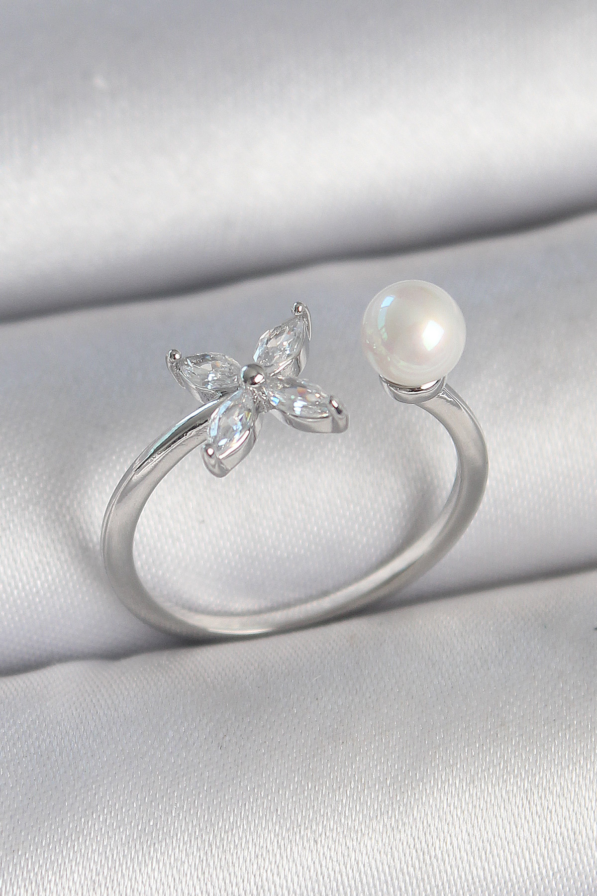 Pirinç Gümüş Renk Zirkon Taşlı Çiçek Model İnci Detay Ayarlanabilir Kadın Yüzük