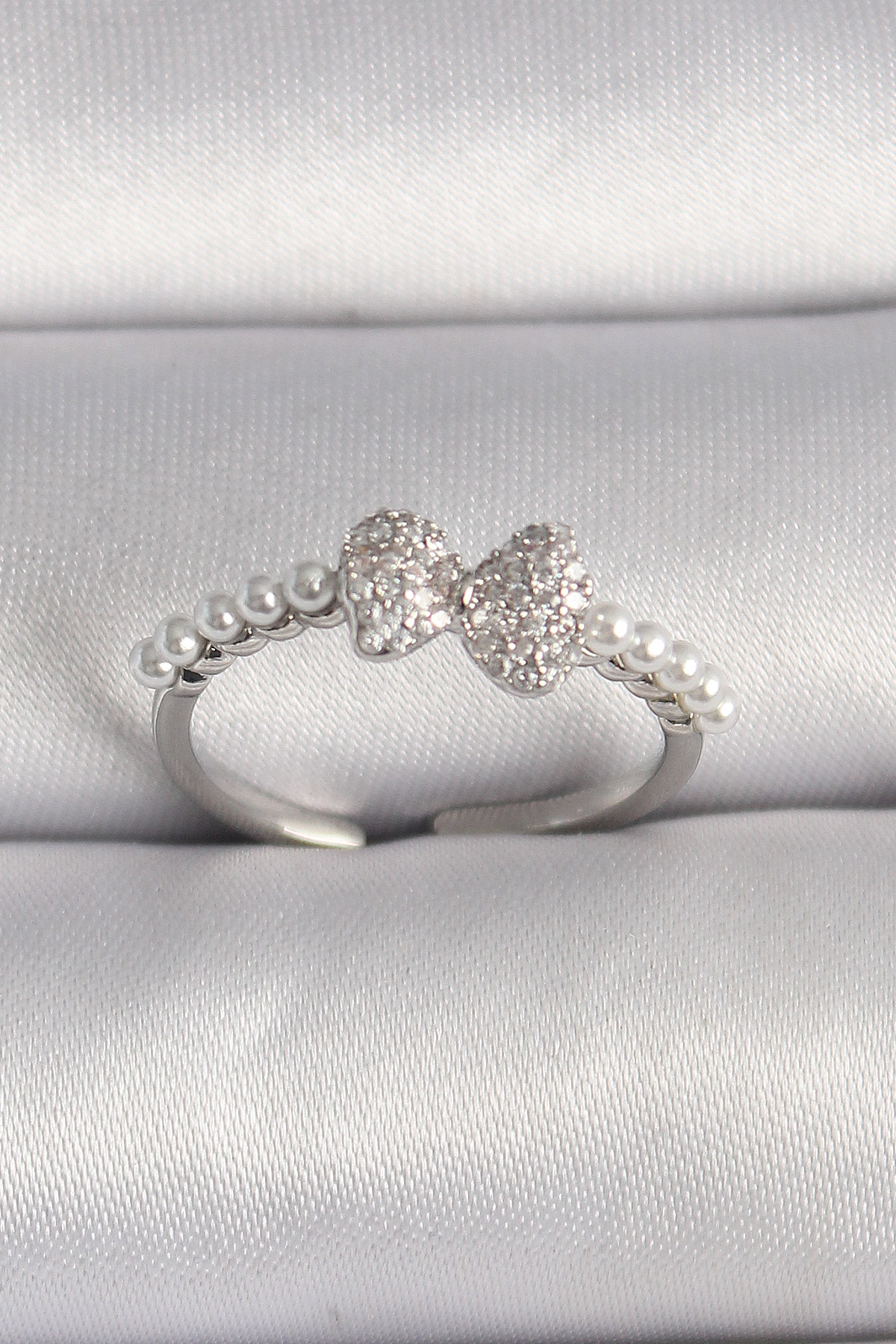 Pirinç Gümüş Renk Zirkon Taşlı Fiyonk İnci Detay Ayarlanabilir Yüzük