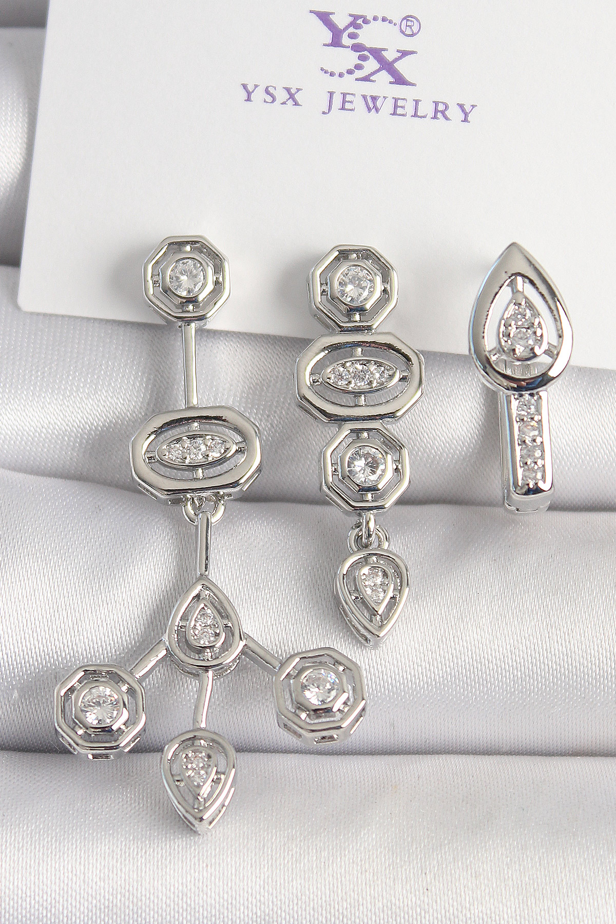 Pirinç Gümüş Renk Zirkon Taşlı Geometrik Model 3’Lü Kadın Kombin Küpe