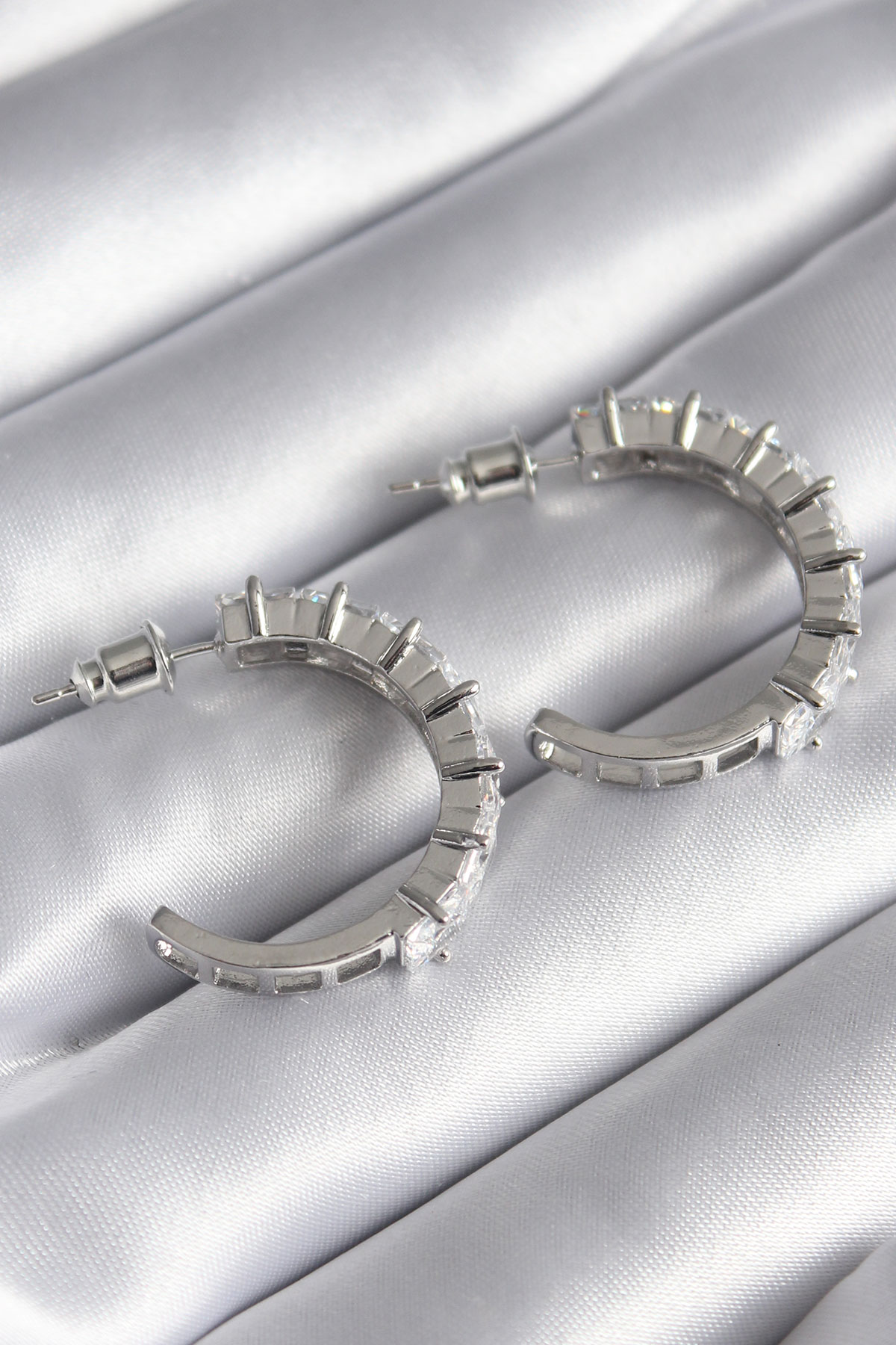 Pirinç Gümüş Renk Zirkon Taşlı Halka Model Kadın Küpe