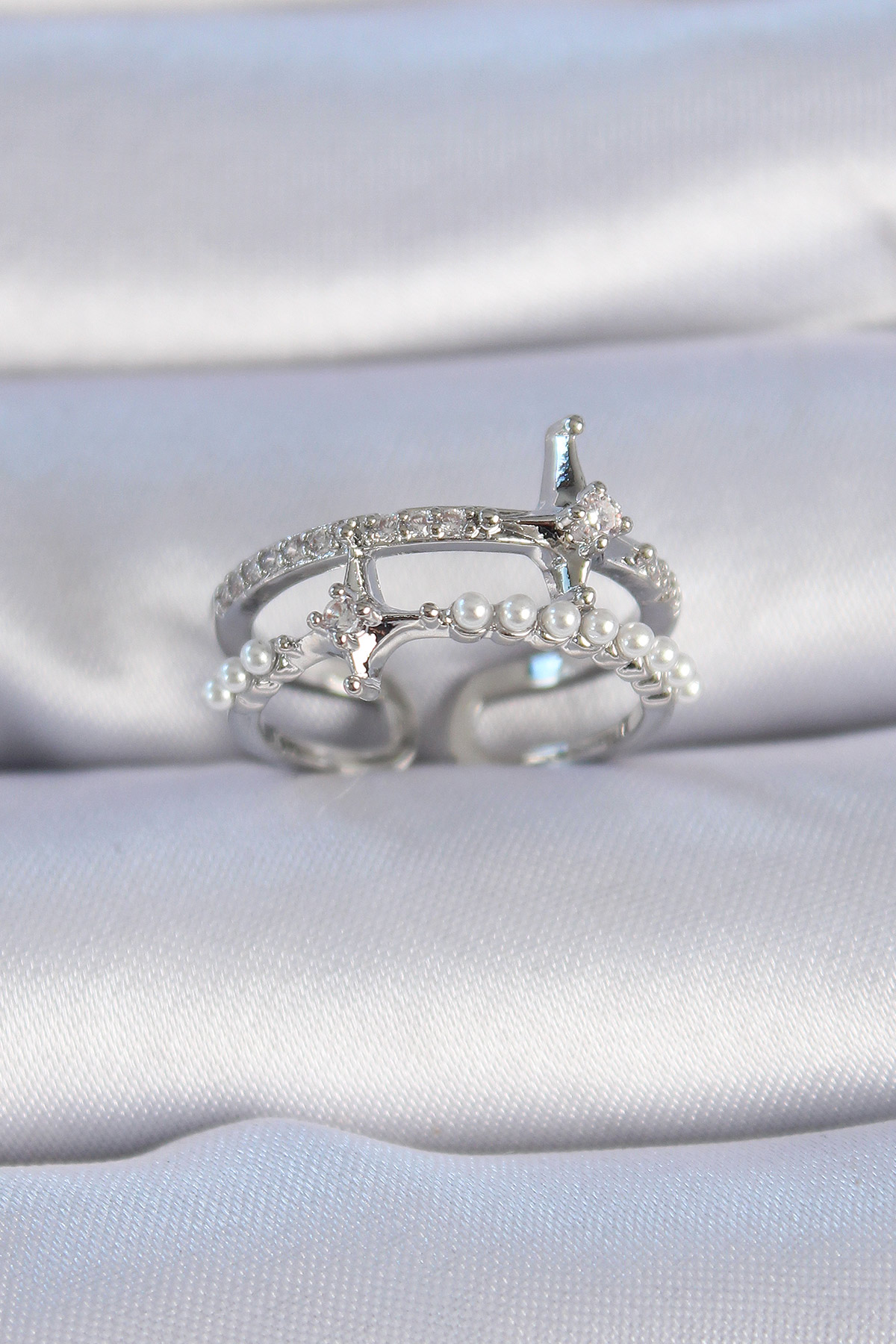Pirinç Gümüş Renk Zirkon Taşlı İnci Detay Kutup Yıldızı Model Kadın Yüzük