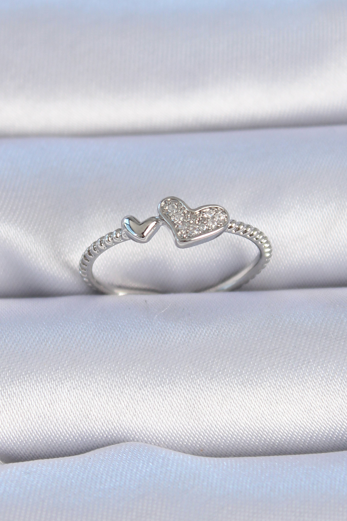 Pirinç Gümüş Renk Zirkon Taşlı Kalp Model Kadın Yüzük