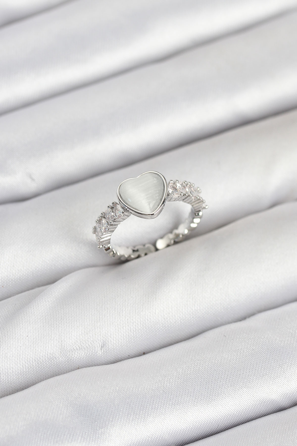 Pirinç Gümüş Renk Zirkon Taşlı Kalpli Kadın Yüzük