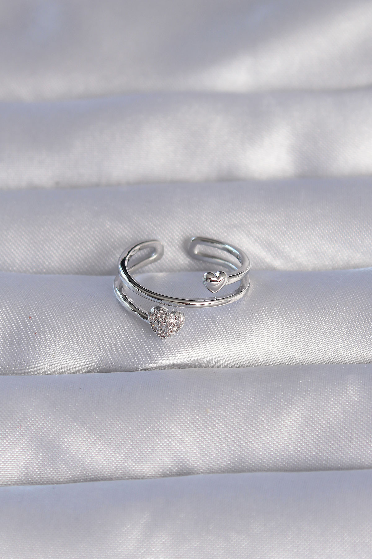 Pirinç Gümüş Renk Zirkon Taşlı Kalpli Model Ayarlanabilir Yüzük