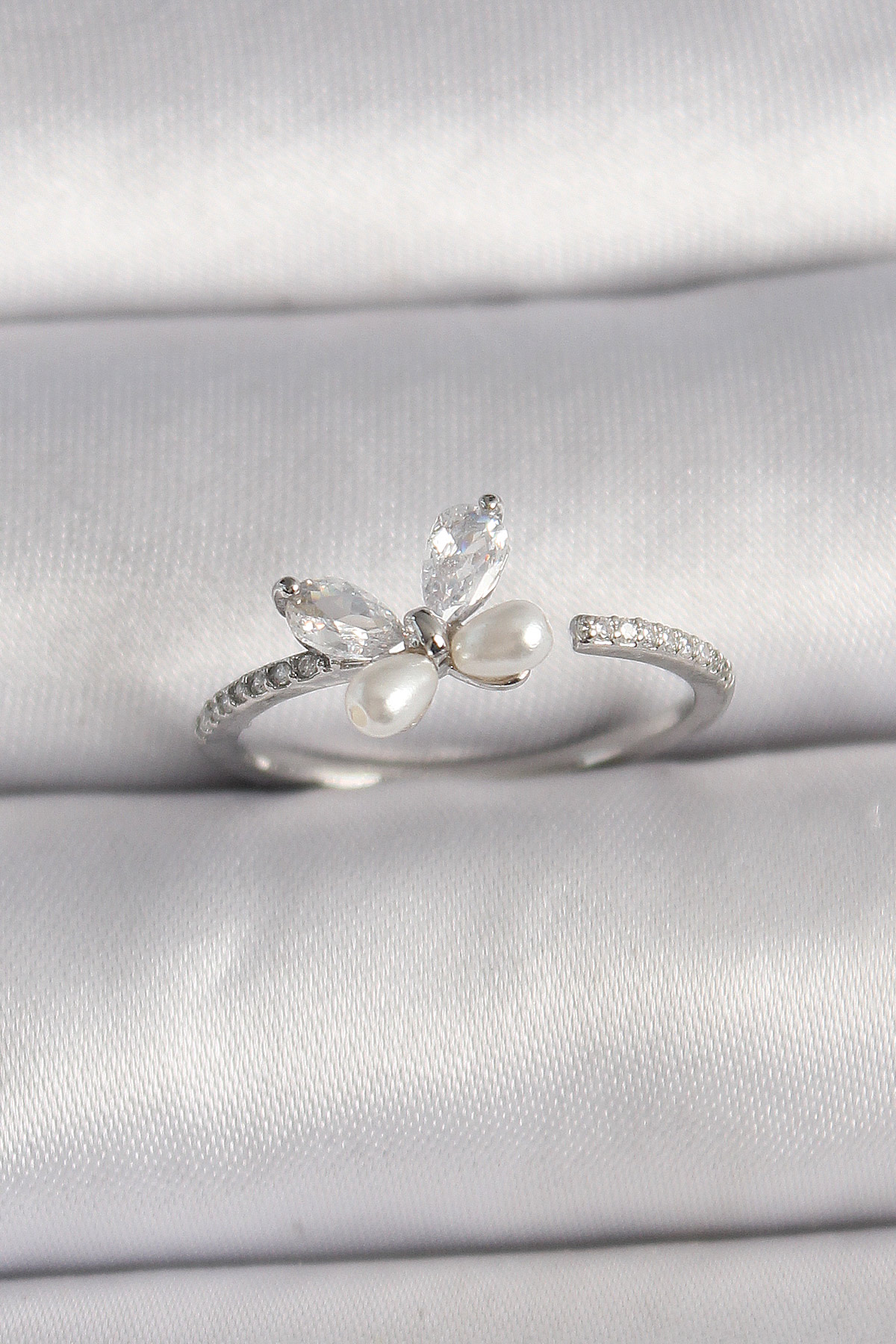 Pirinç Gümüş Renk Zirkon Taşlı Kelebek Model İnci Detaylı Ayarlanabilir Yüzük