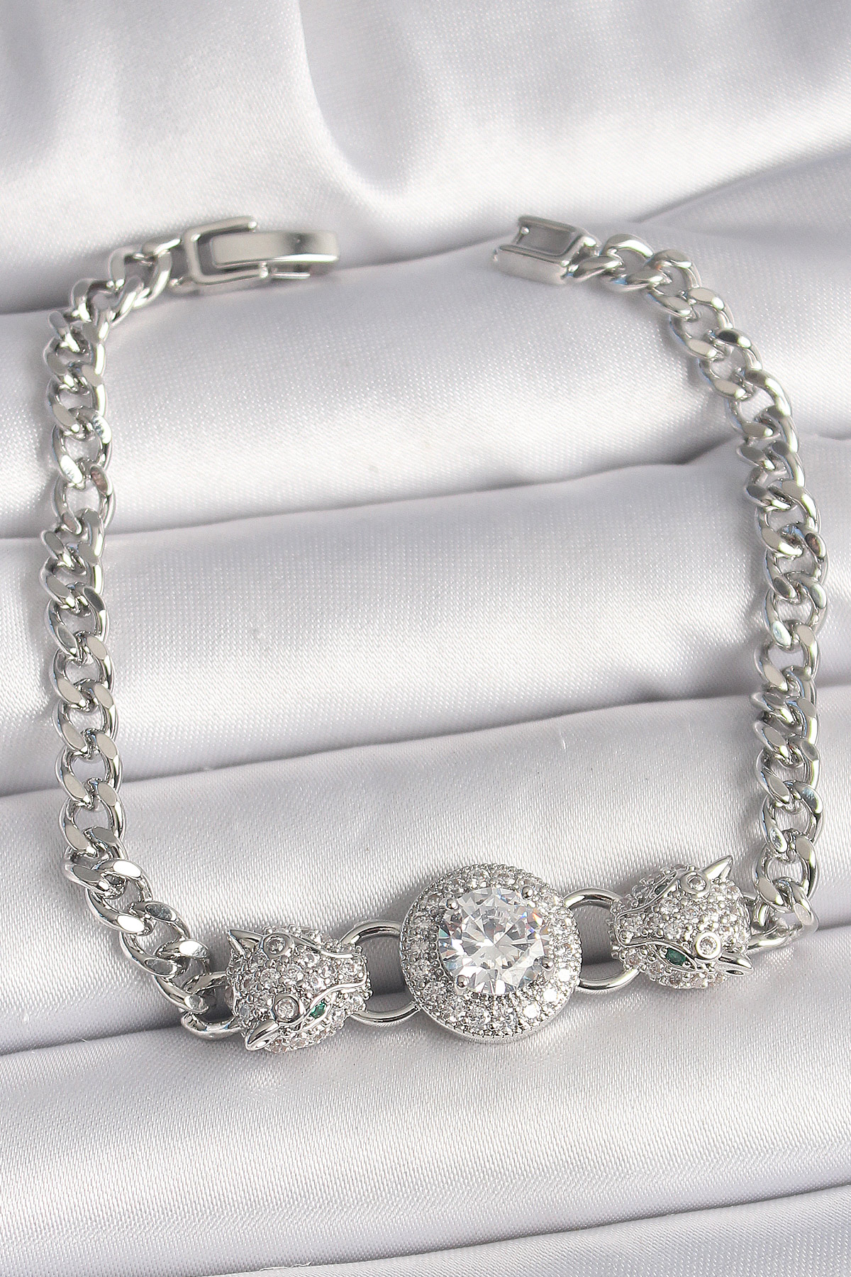 Pirinç Gümüş Renk Zirkon Taşlı Leopar Figür Zincir Model Kadın Bileklik