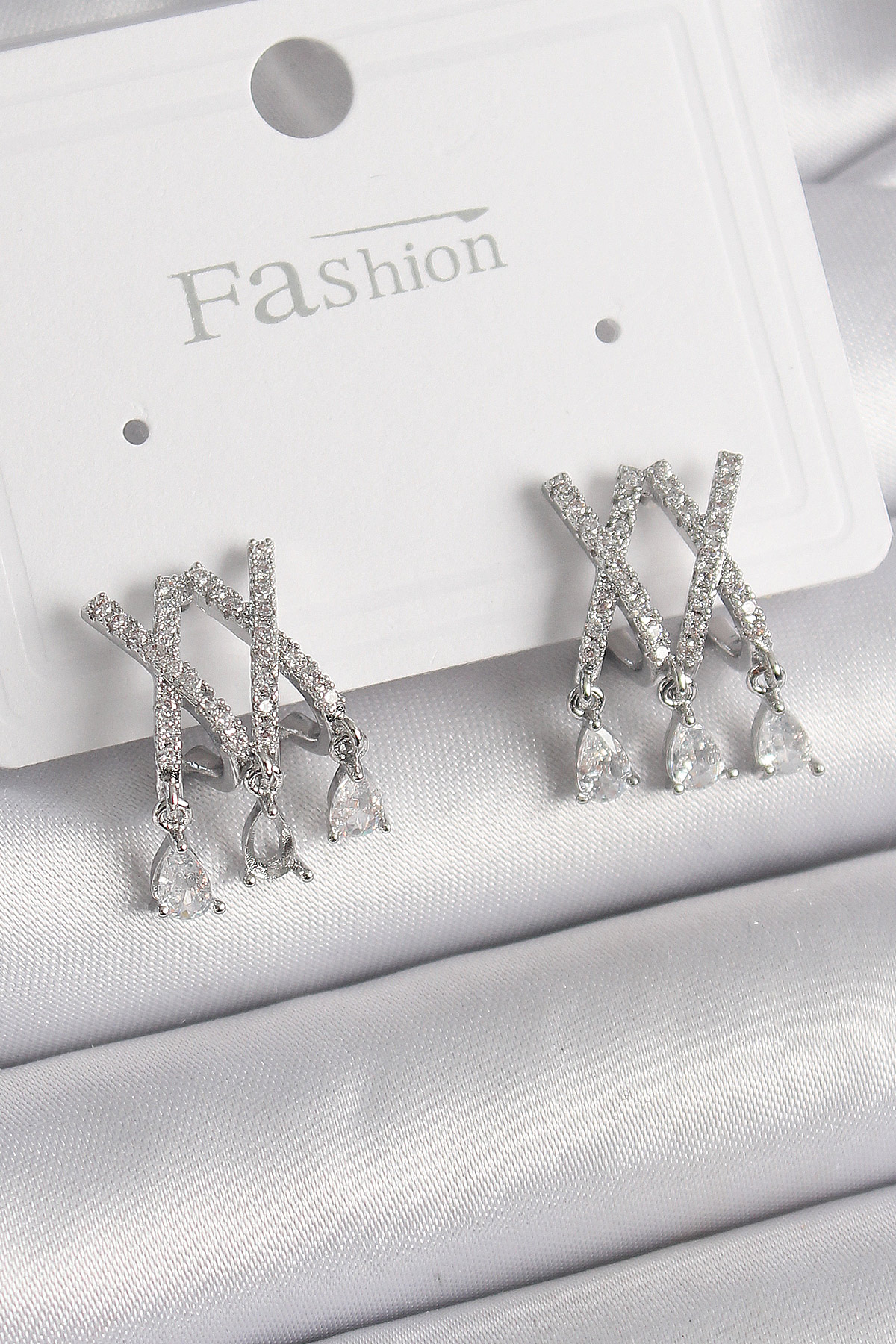 Pirinç Gümüş Renk Zirkon Taşlı X Model Sallantı Detay Kadın Küpe