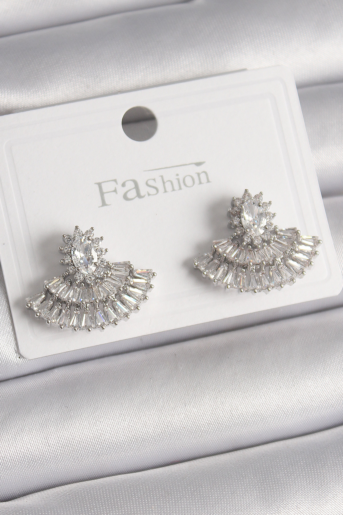 Pirinç Gümüş Renk Zirkon Taşlı Yelpaze Model Kadın Küpe