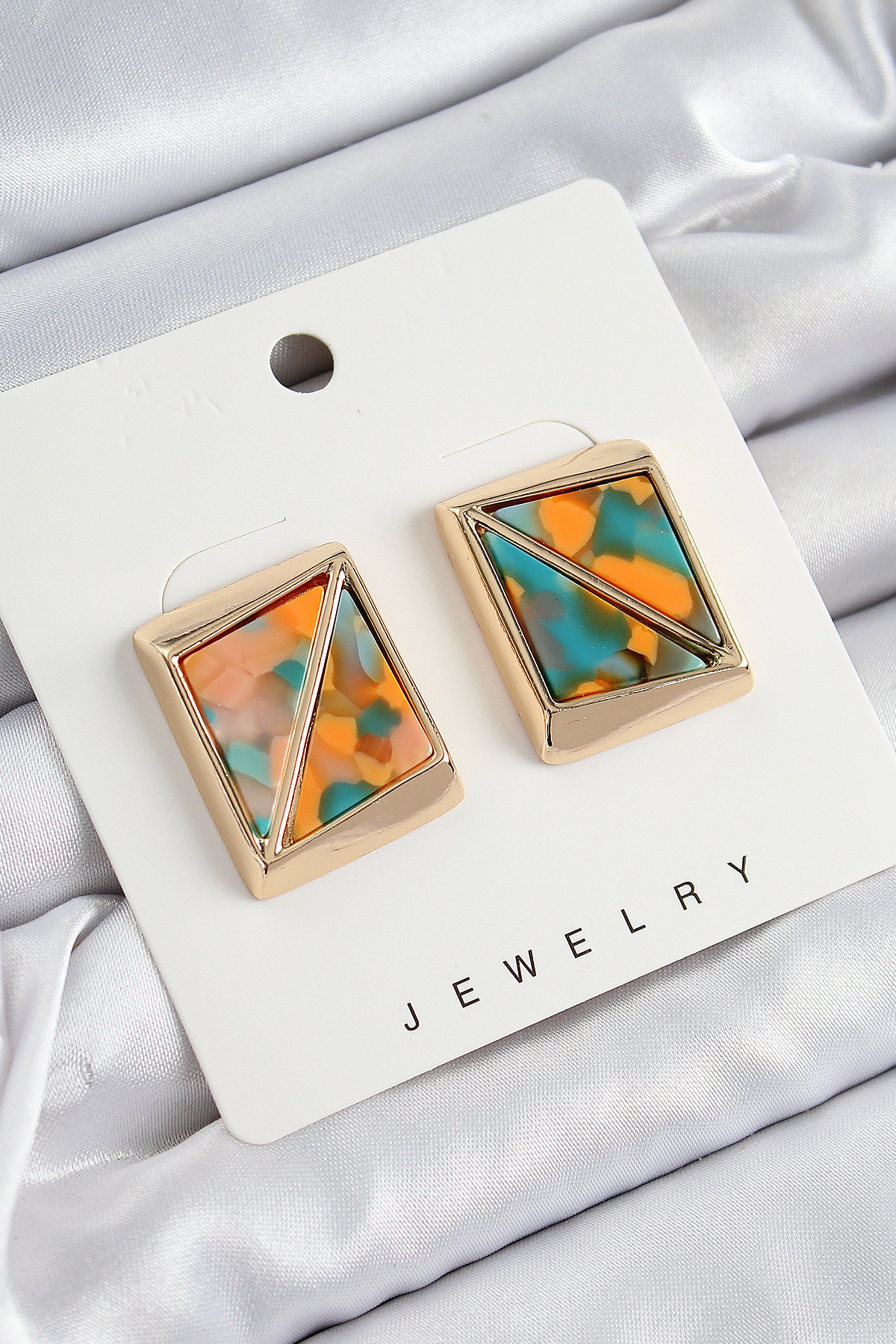 Pirinç Turuncu Yeşil Üçgen Kesim Detaylı Kare Model Vintage Gold Renk Kadın Küpe
