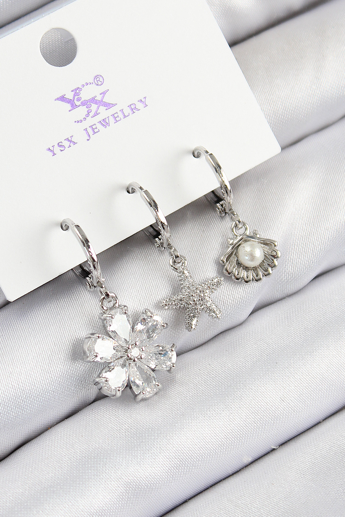 Pirinç Zirkon Taşlı 3’lü Çiçek Ve İstiridye Model Gümüş Renk Kadın Küpe
