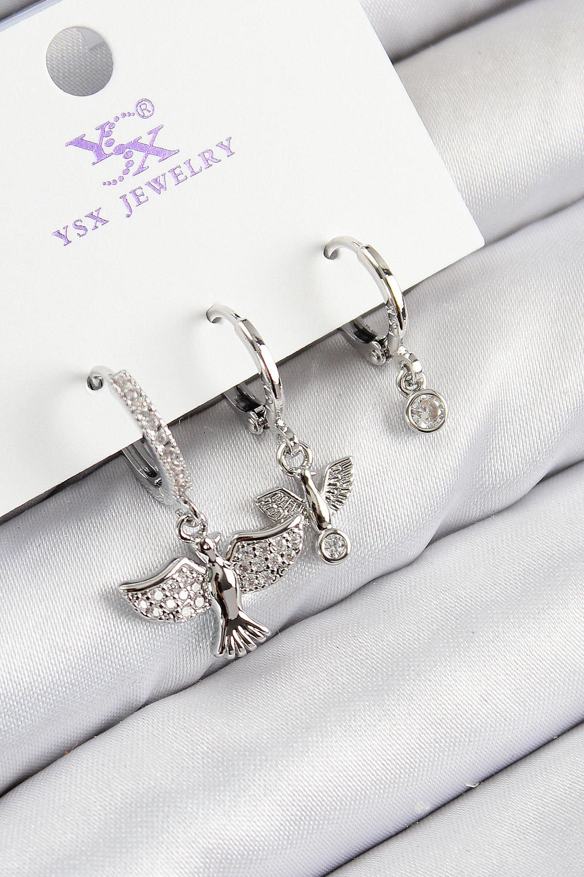 Pirinç Zirkon Taşlı 3’lü Kuş Model Gümüş Renk Kadın Küpe