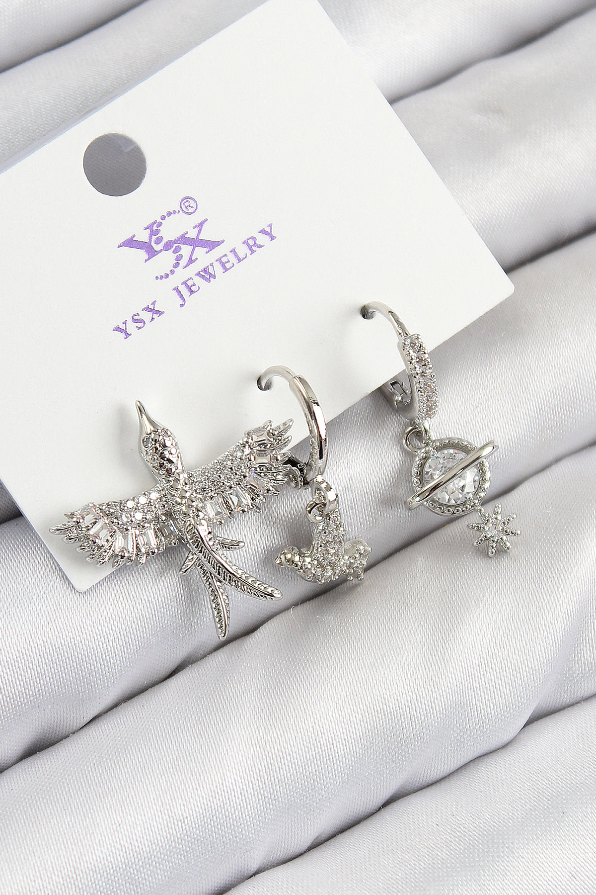 Pirinç Zirkon Taşlı 3’lü Kuş Model Gümüş Renk Kadın Küpe