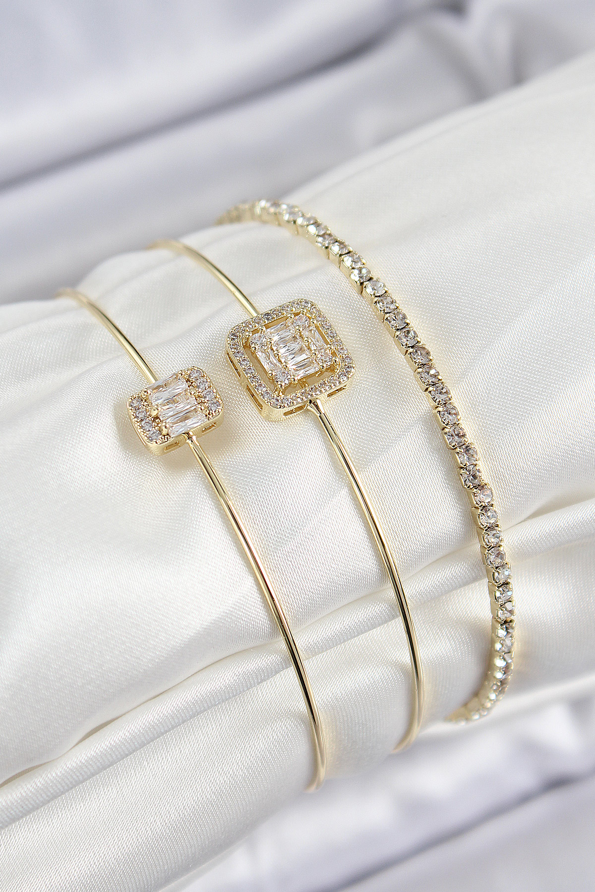 Pirinç Zirkon Taşlı Baget Model Gold Renk Vip 3’lü Kadın Bileklik