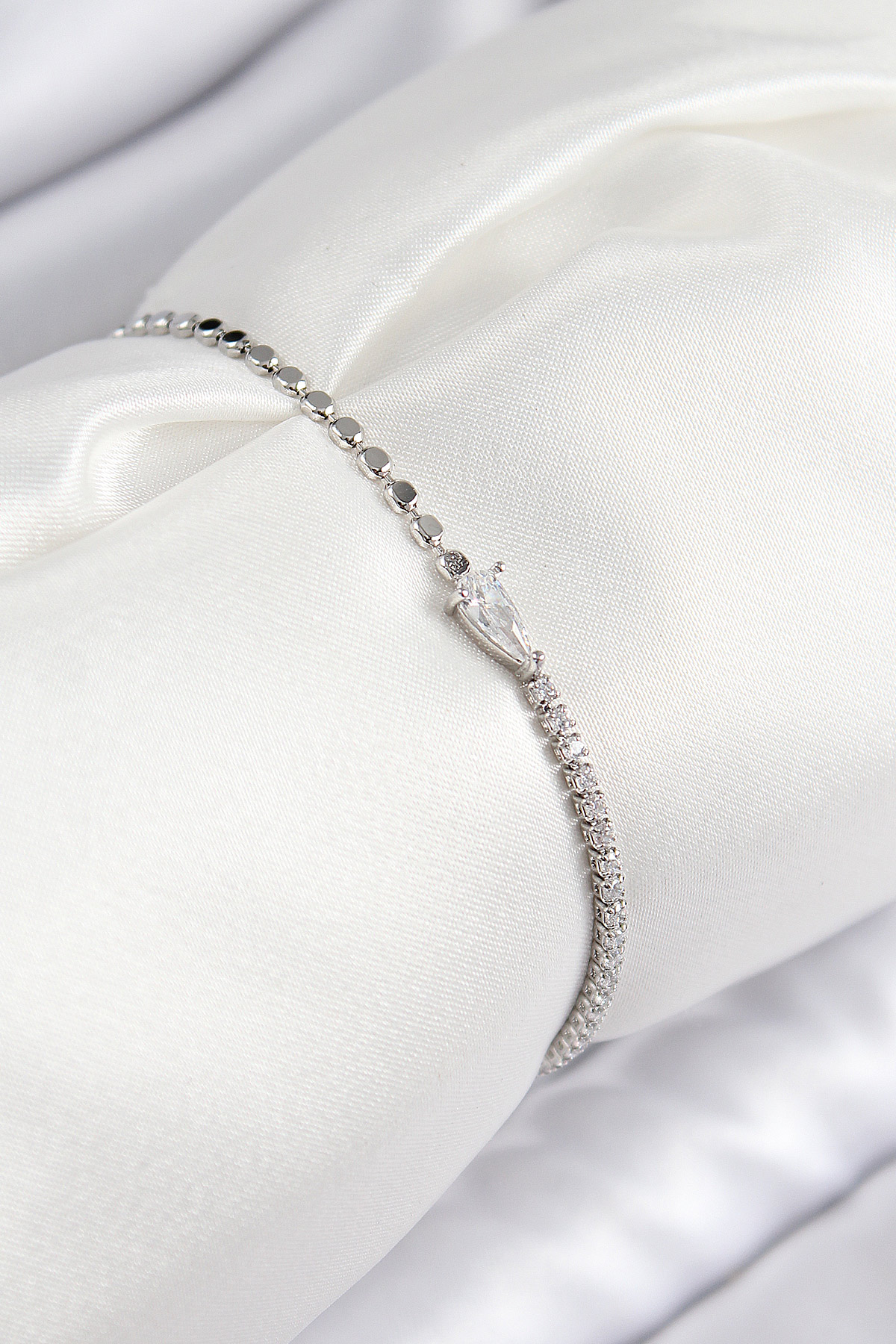Pirinç Zirkon Taşlı Damla Model Ezme Zincir Gümüş Renk Kadın Bileklik