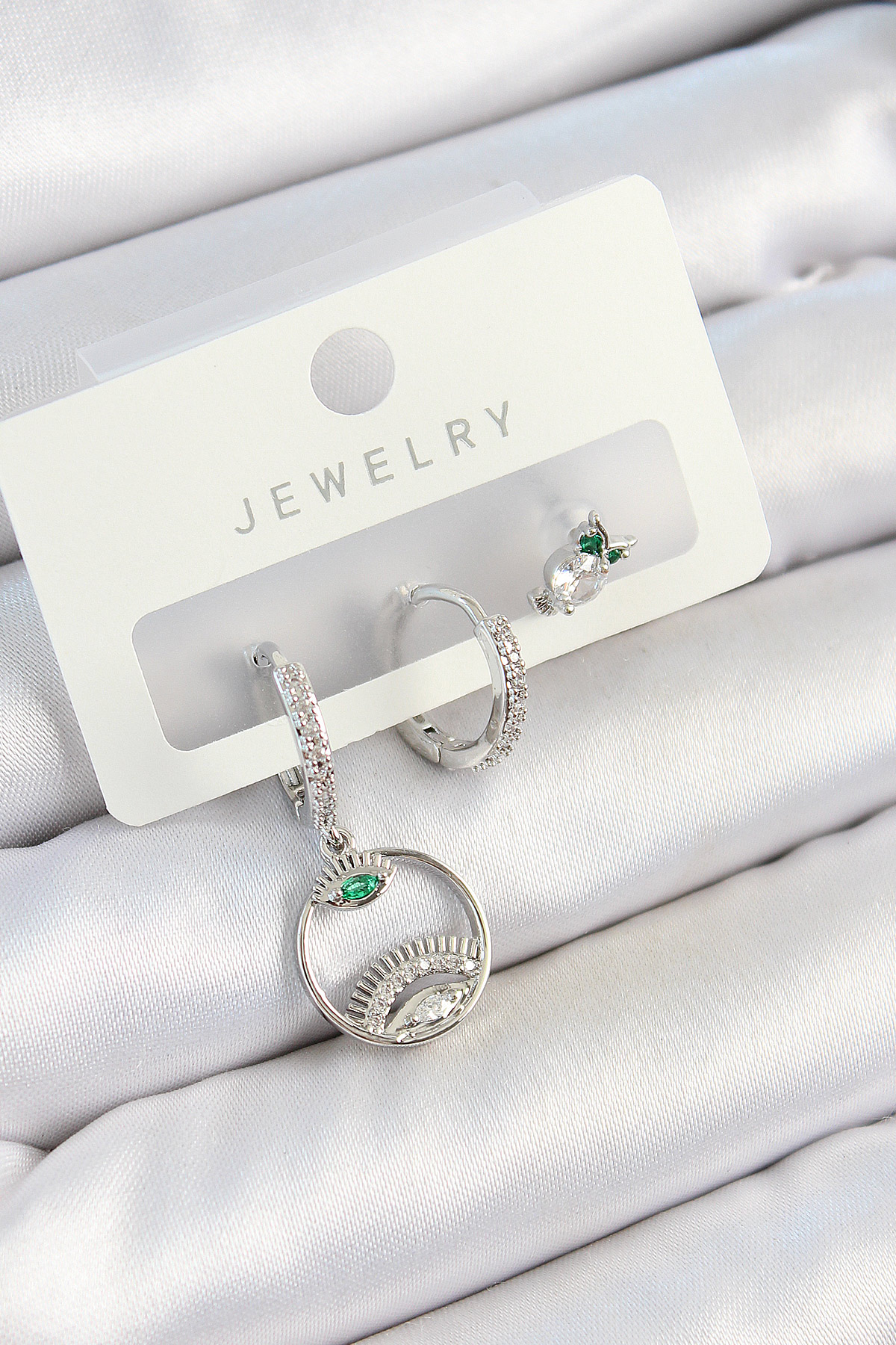 Pirinç Zirkon Taşlı Göz Ve Baykuş Model Gümüş Renk 3’lü Çift Kadın Küpe Set