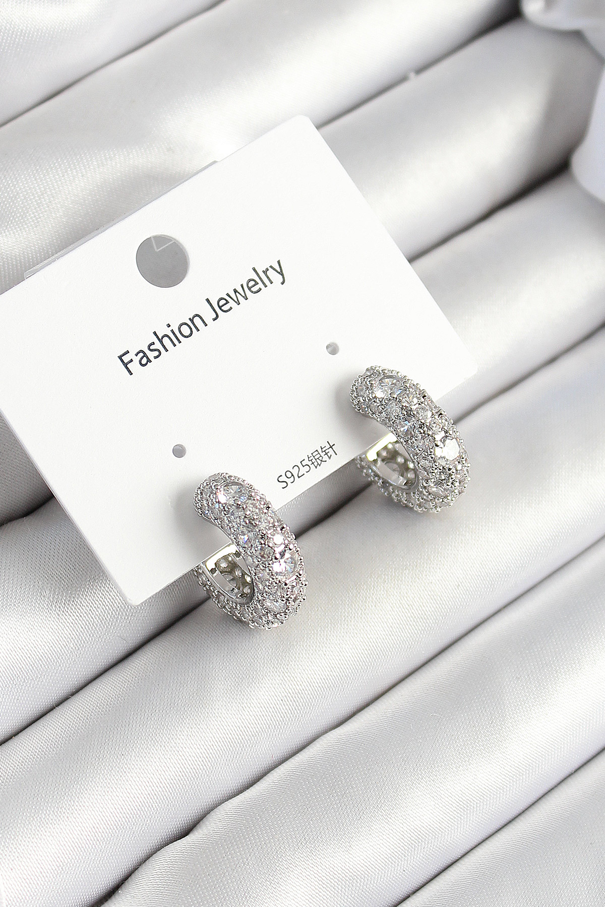 Pirinç Zirkon Taşlı Halka Model Gümüş Renk Kadın Küpe
