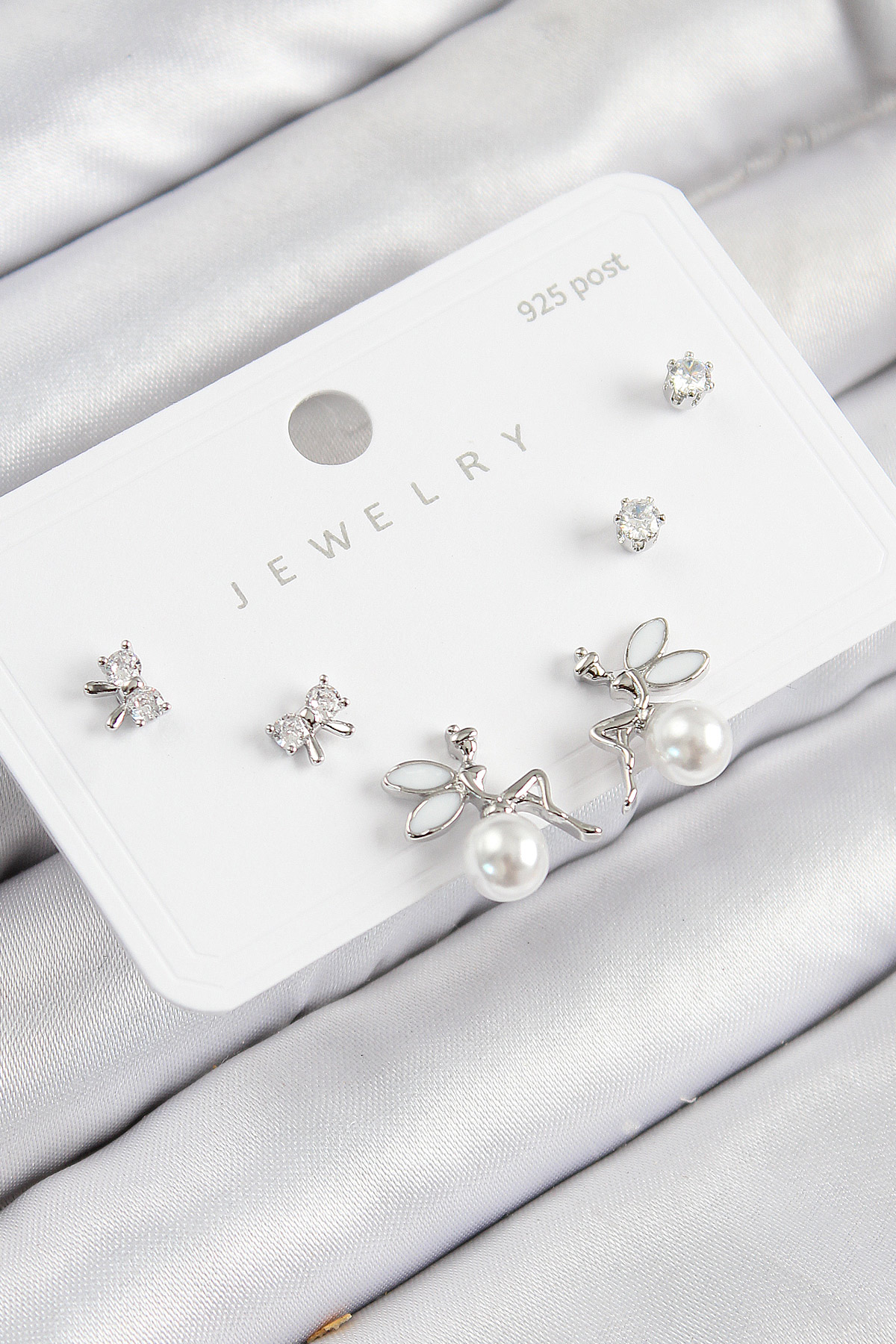 Pirinç Zirkon Taşlı İnci Melek Model Gümüş Renk 925 Ayar Gümüş Çivi Kadın Küpe Set