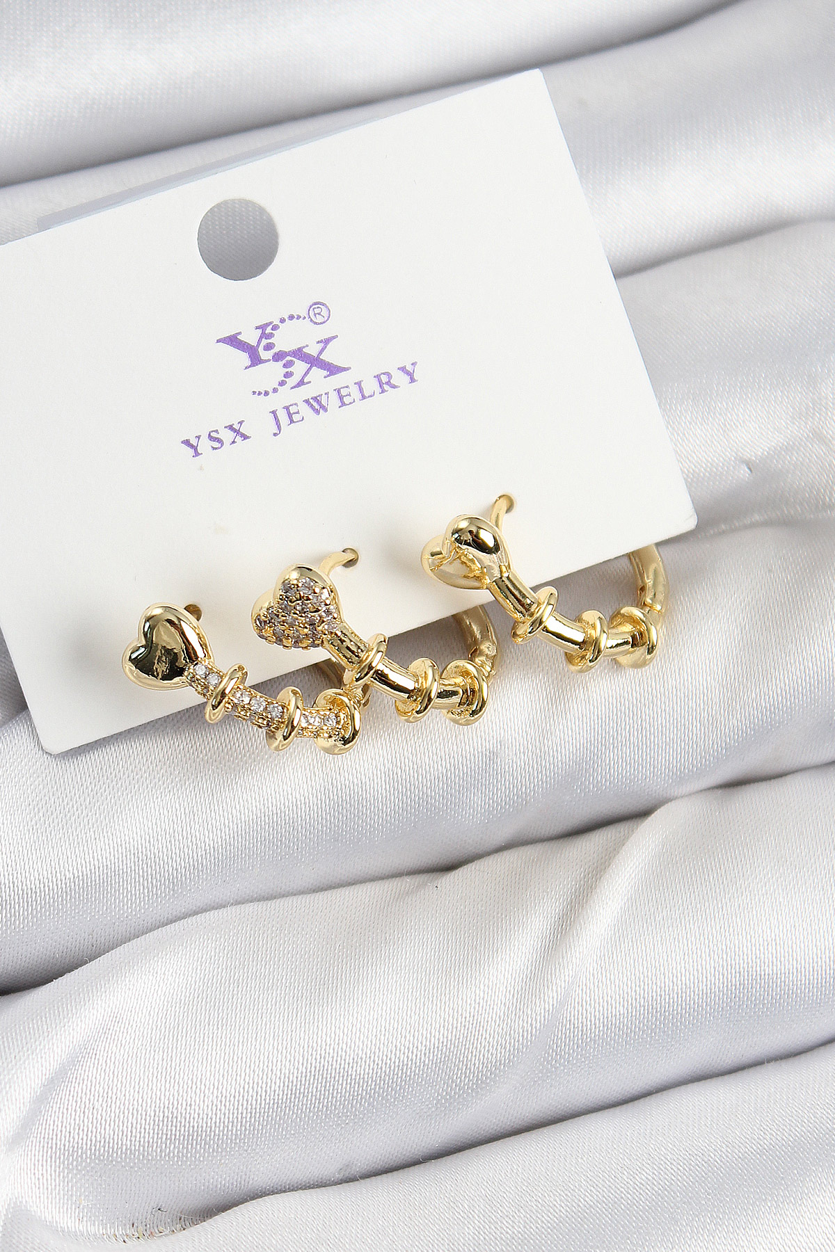 Pirinç Zİrkon Taşlı Kalp Model Gold Renk 3’lü Kadın Küpe