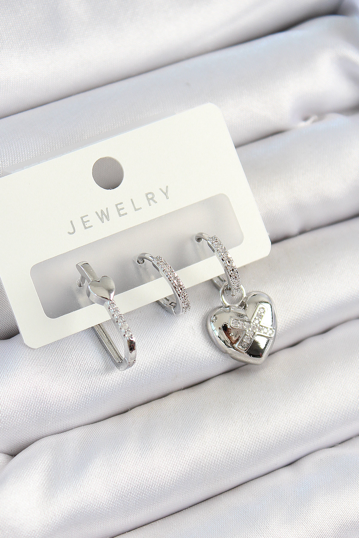 Pirinç Zirkon Taşlı Kalp Model Gümüş Renk 3’lü Çift Kadın Küpe Set