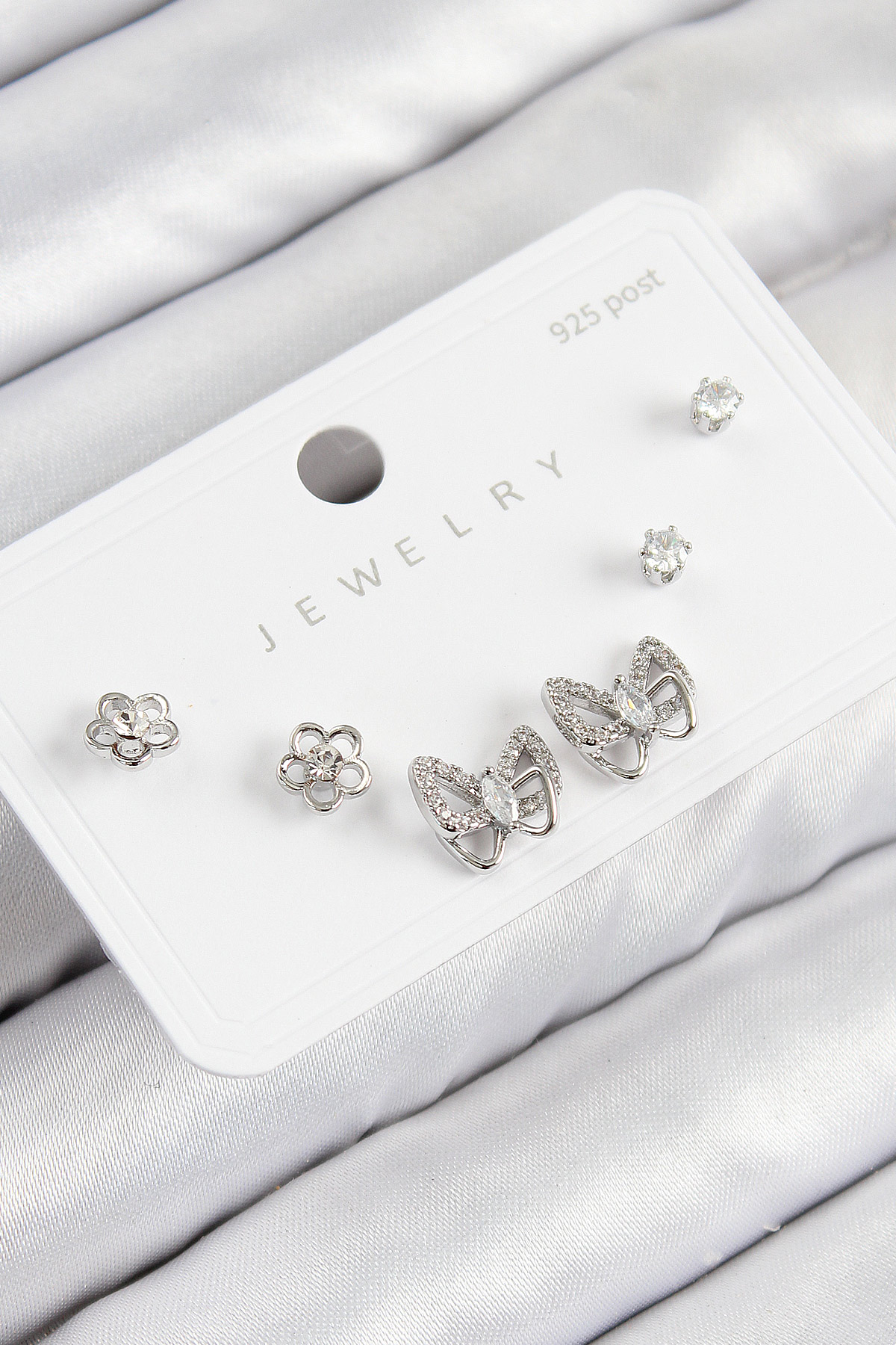 Pirinç Zirkon Taşlı Kelebek Model Gümüş Renk 925 Ayar Gümüş Çivi Kadın Küpe Set
