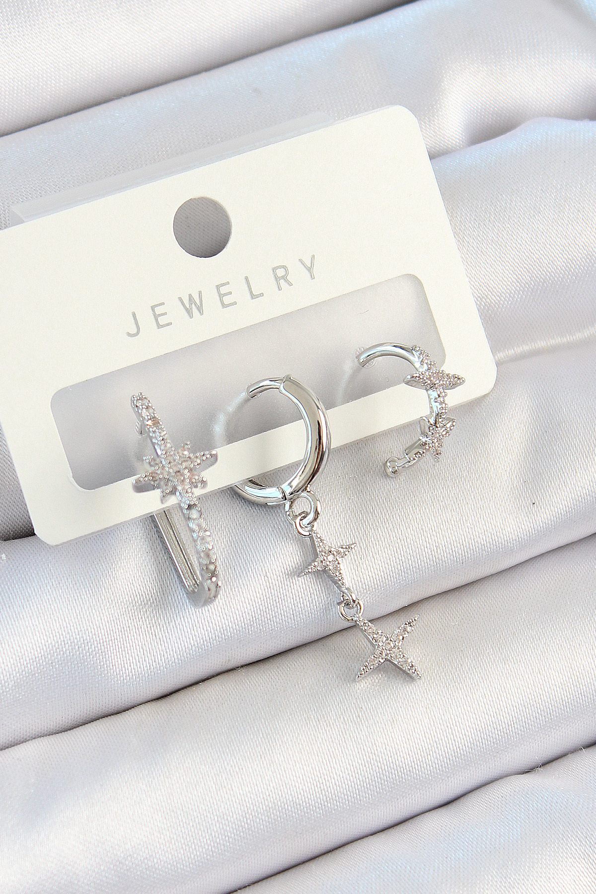 Pirinç Zirkon Taşlı Kelebek Ve Sallantılı Yıldız Model Gümüş Renk 3’lü Çift Kadın Küpe Set