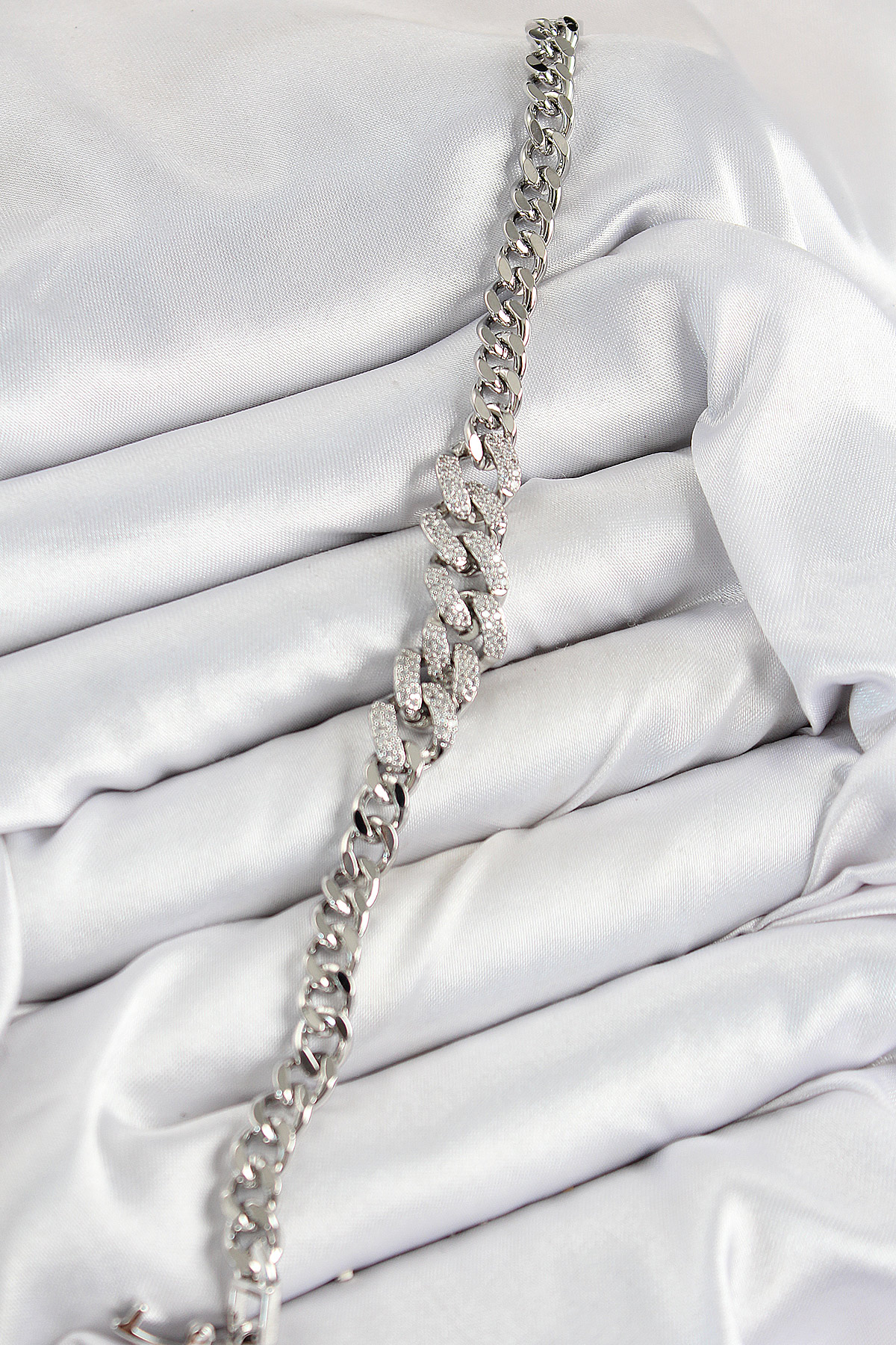 Pirinç Zirkon Taşlı Küba Zincir Model Gümüş Renk Kadın Bileklik