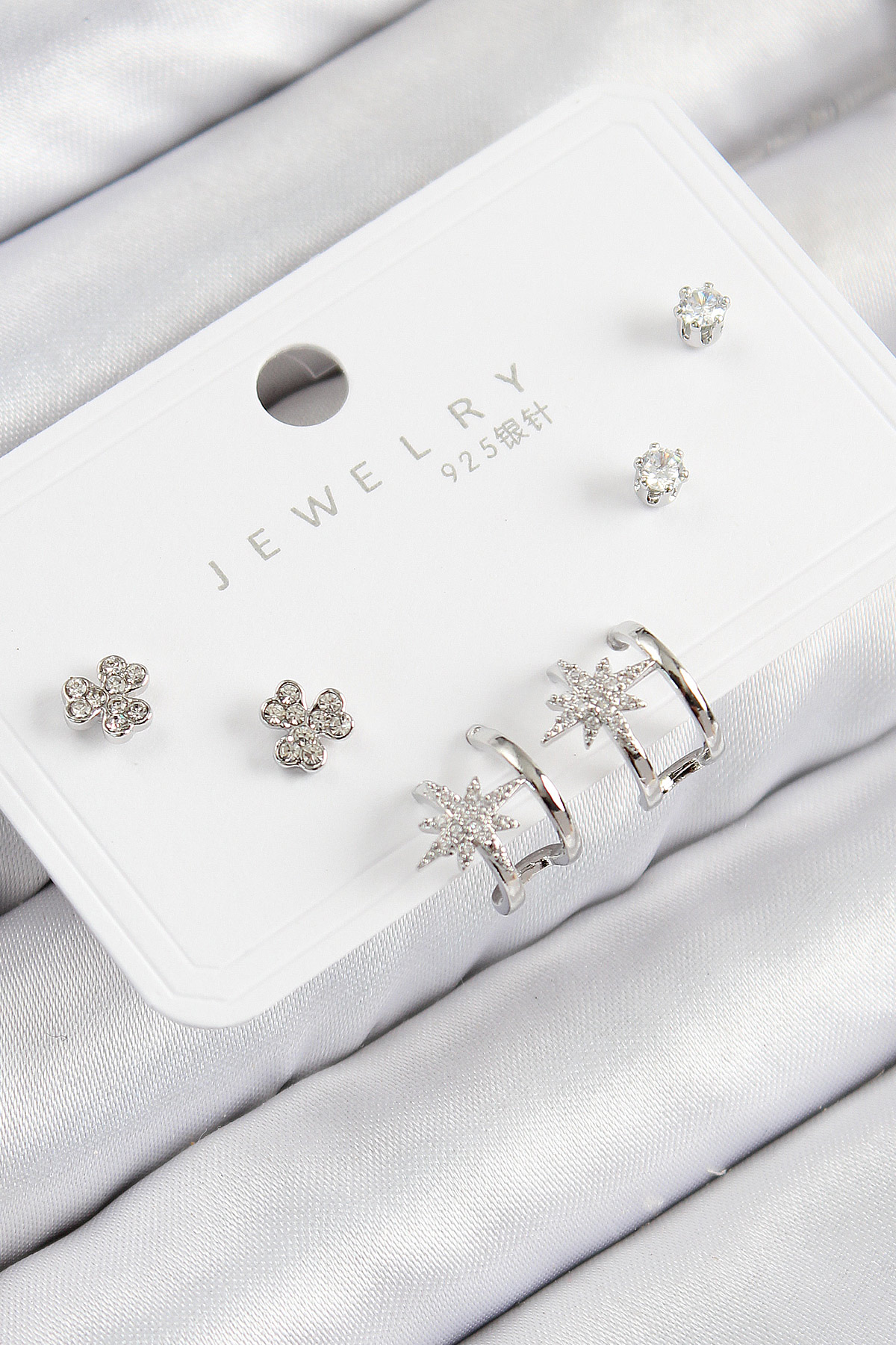 Pirinç Zirkon Taşlı Kutup Yıldızı Model Gümüş Renk 925 Ayar Gümüş Çivi Kadın Küpe Set