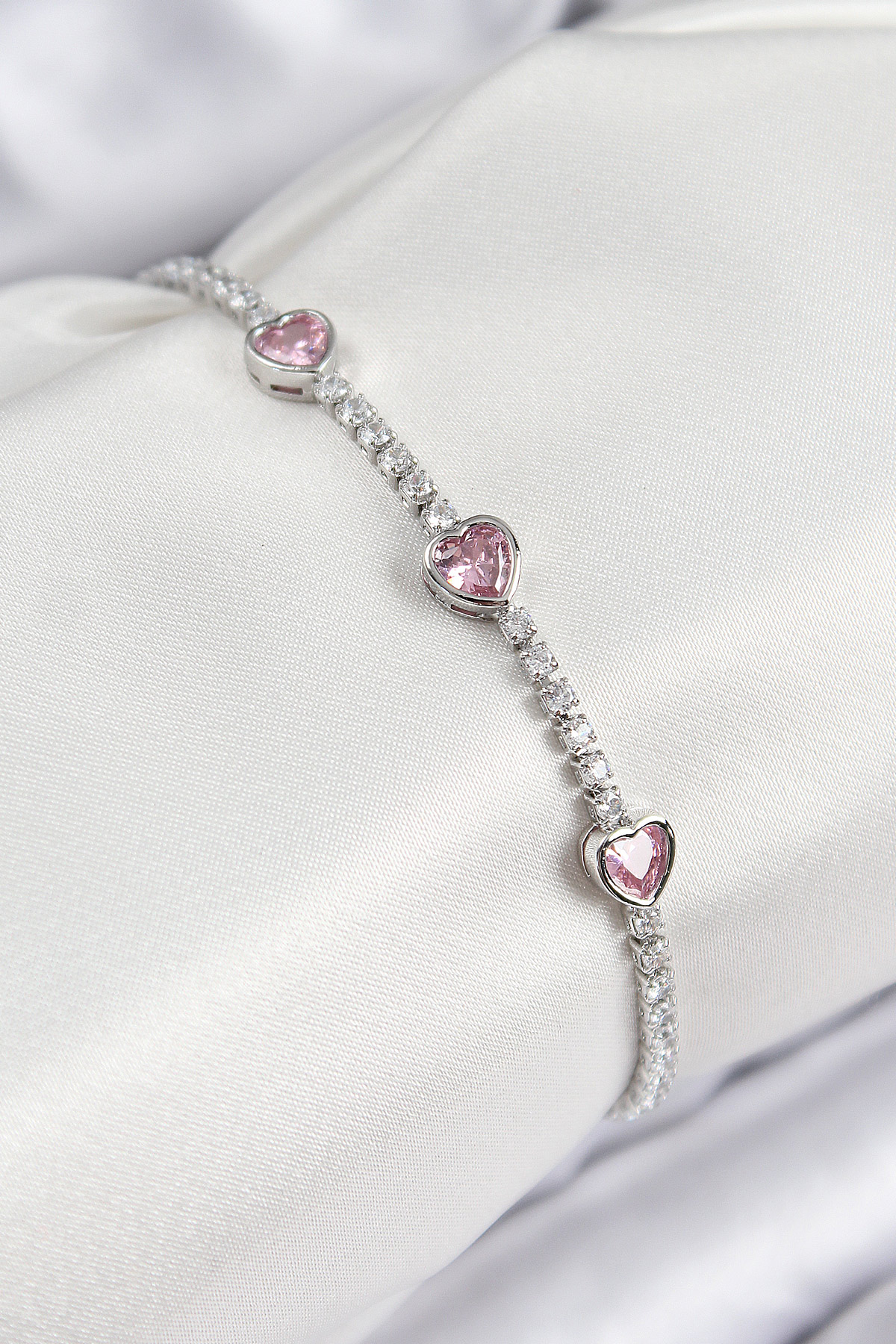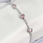 Pirinç Zirkon Taşlı Pembe Kalp Model Gümüş Renk Kadın Bileklik