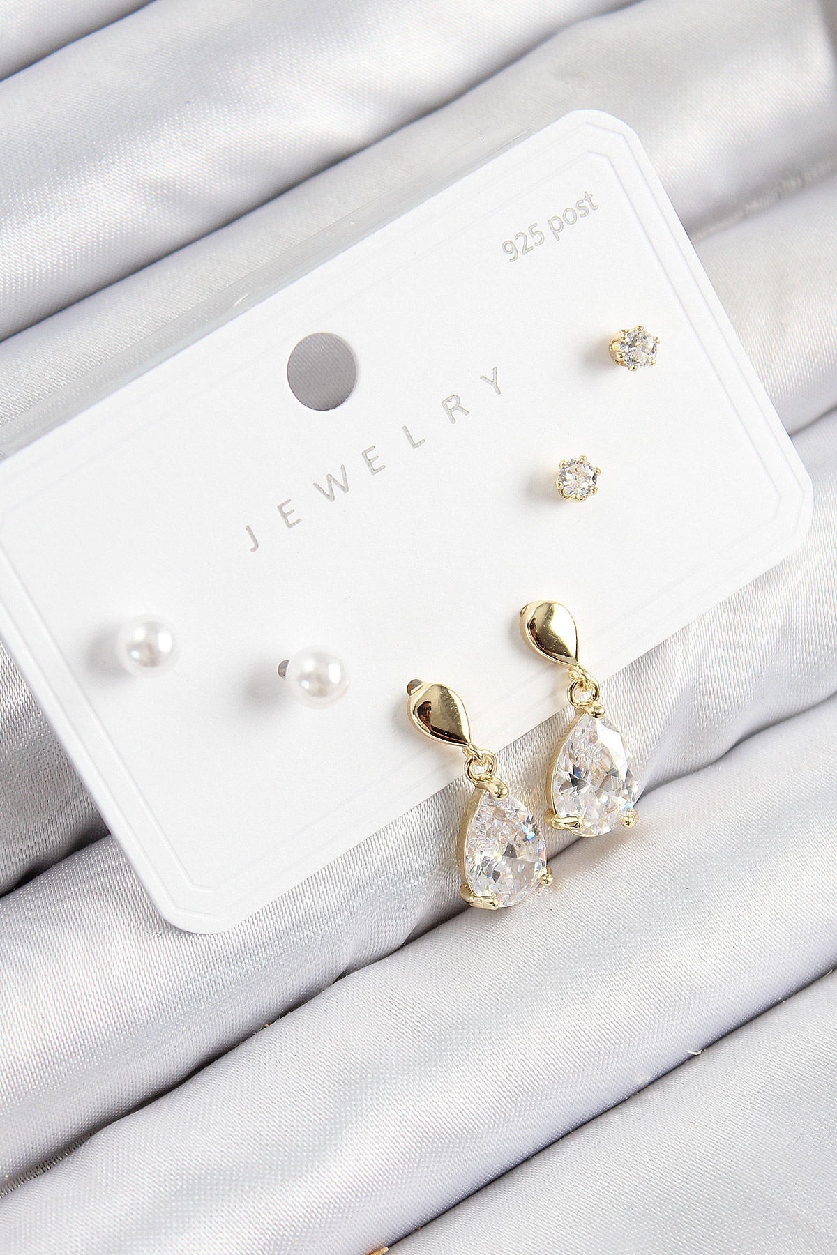 Pirinç Zirkon Taşlı Sallantılı Damla Model Gold Renk 925 Ayar Gümüş Çivi Kadın Küpe Set