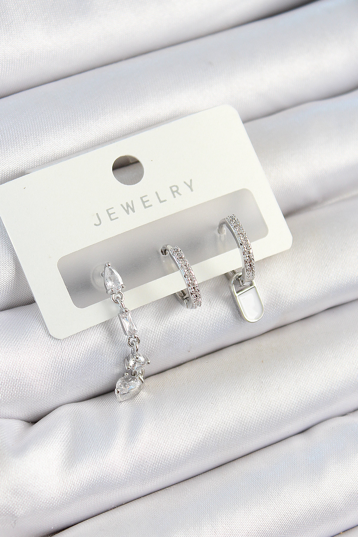 Pirinç Zirkon Taşlı Sallantılı Model Gümüş Renk 3’lü Çift Kadın Küpe Set