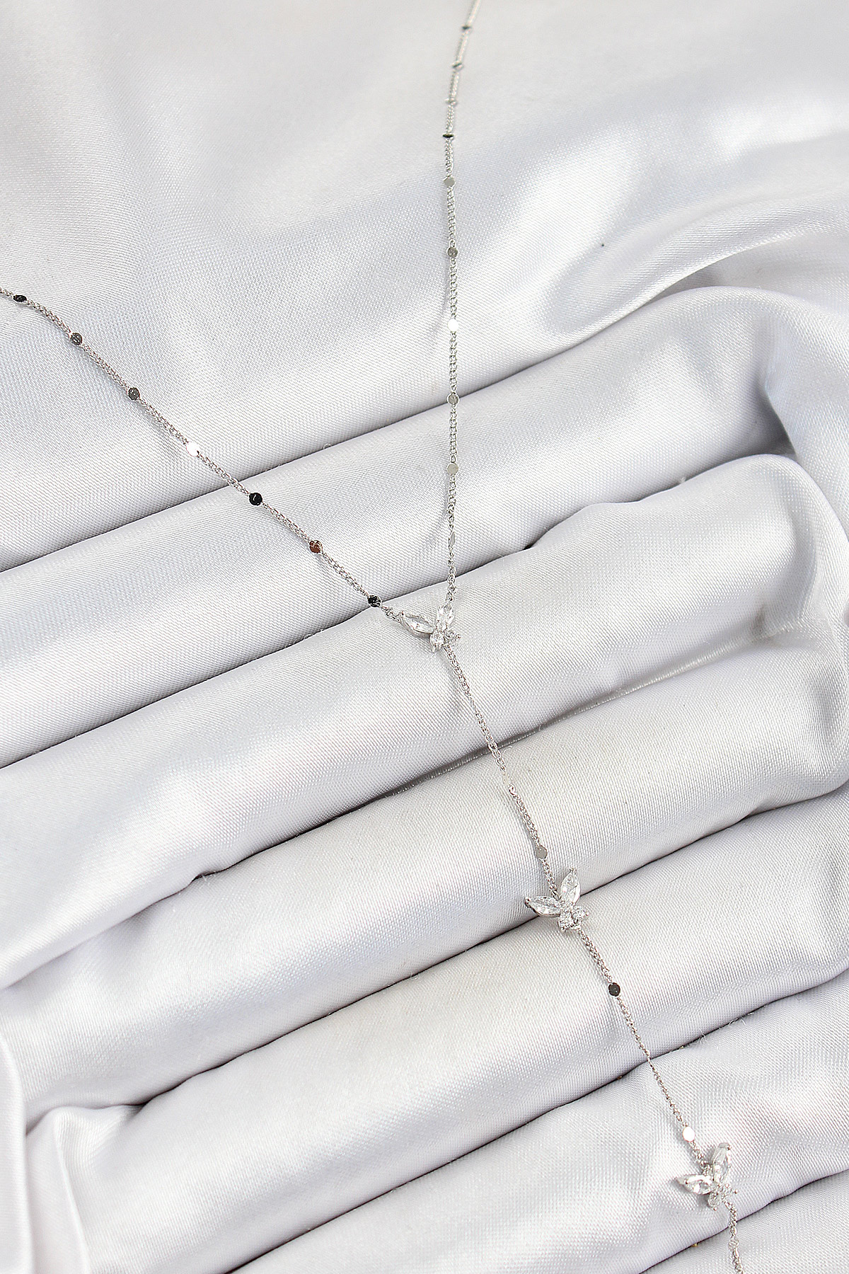 Pirinç Zirkon Taşlı Sıralı Kelebek Figürlü Y Model Gümüş Renk Kadın Kolye
