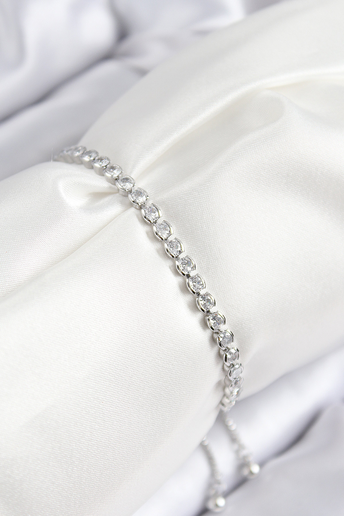 Pirinç Zirkon Taşlı Sıralı Model Gümüş Renk Asansörlü Kadın Bileklik