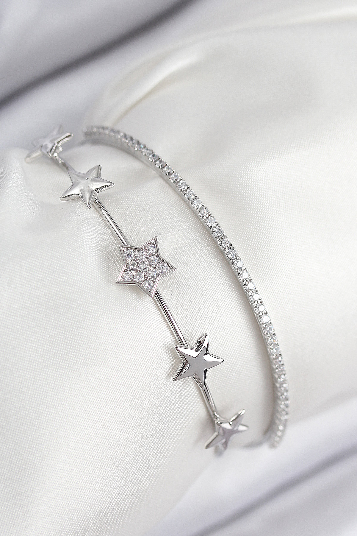 Pirinç Zirkon Taşlı Yıldız Model Gümüş Renk Kadın Bileklik