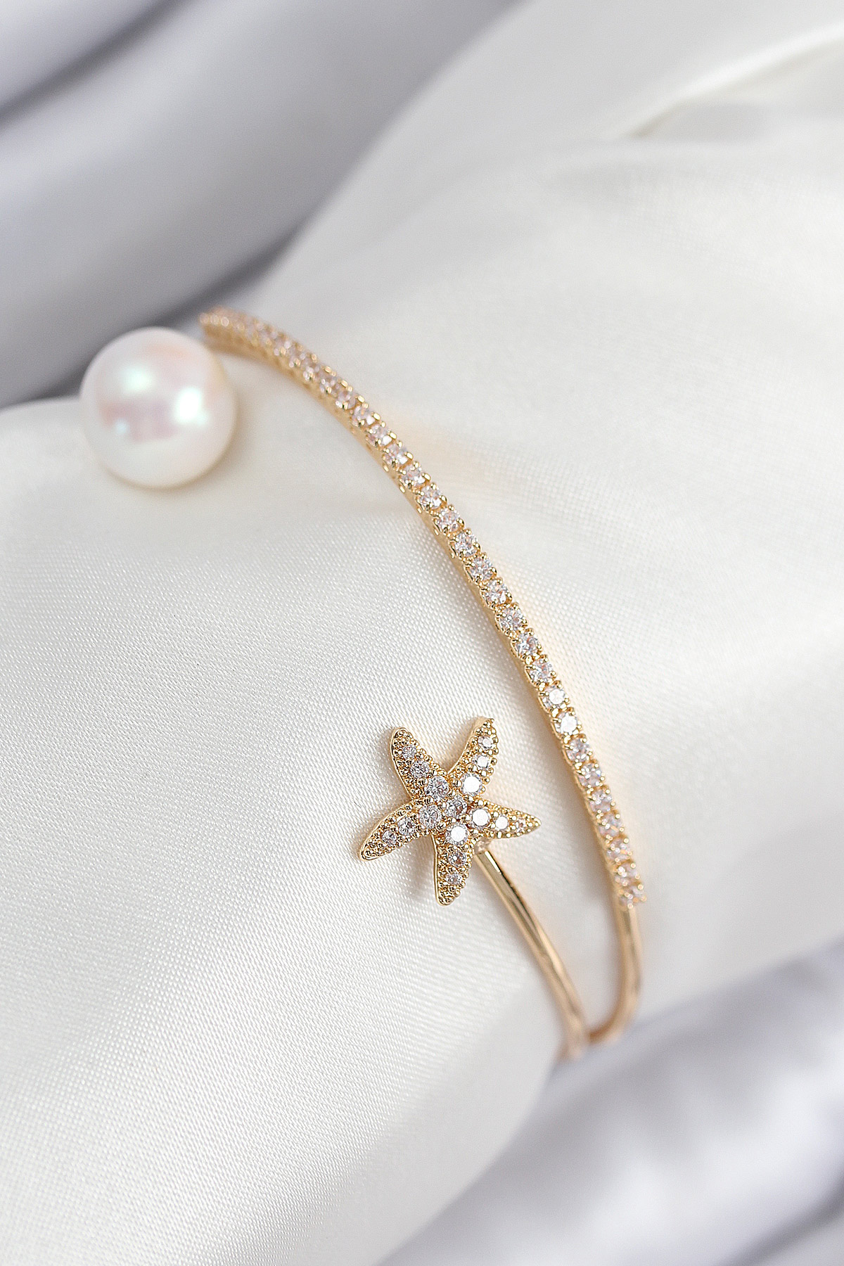 Pirinç Zirkon Taşlı Yıldız Ve İnci Model Gold Renk Kadın Bileklik