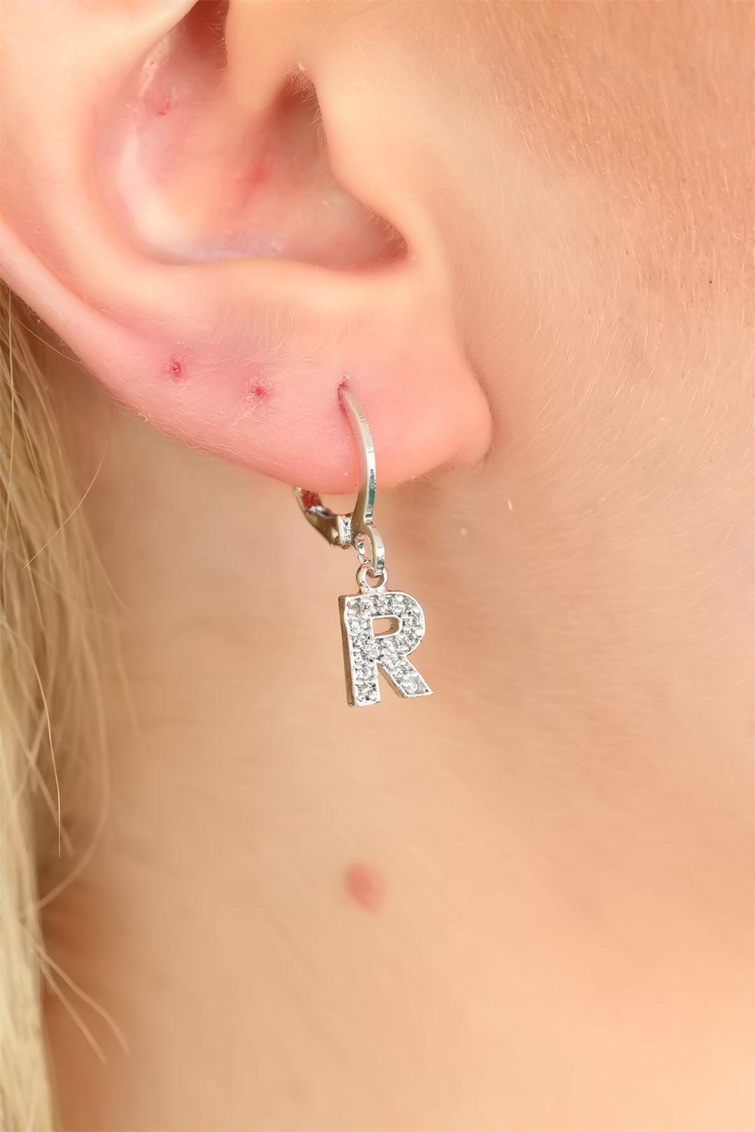Silver Renk Zirkon Taşlı R Harf Bayan Küpe
