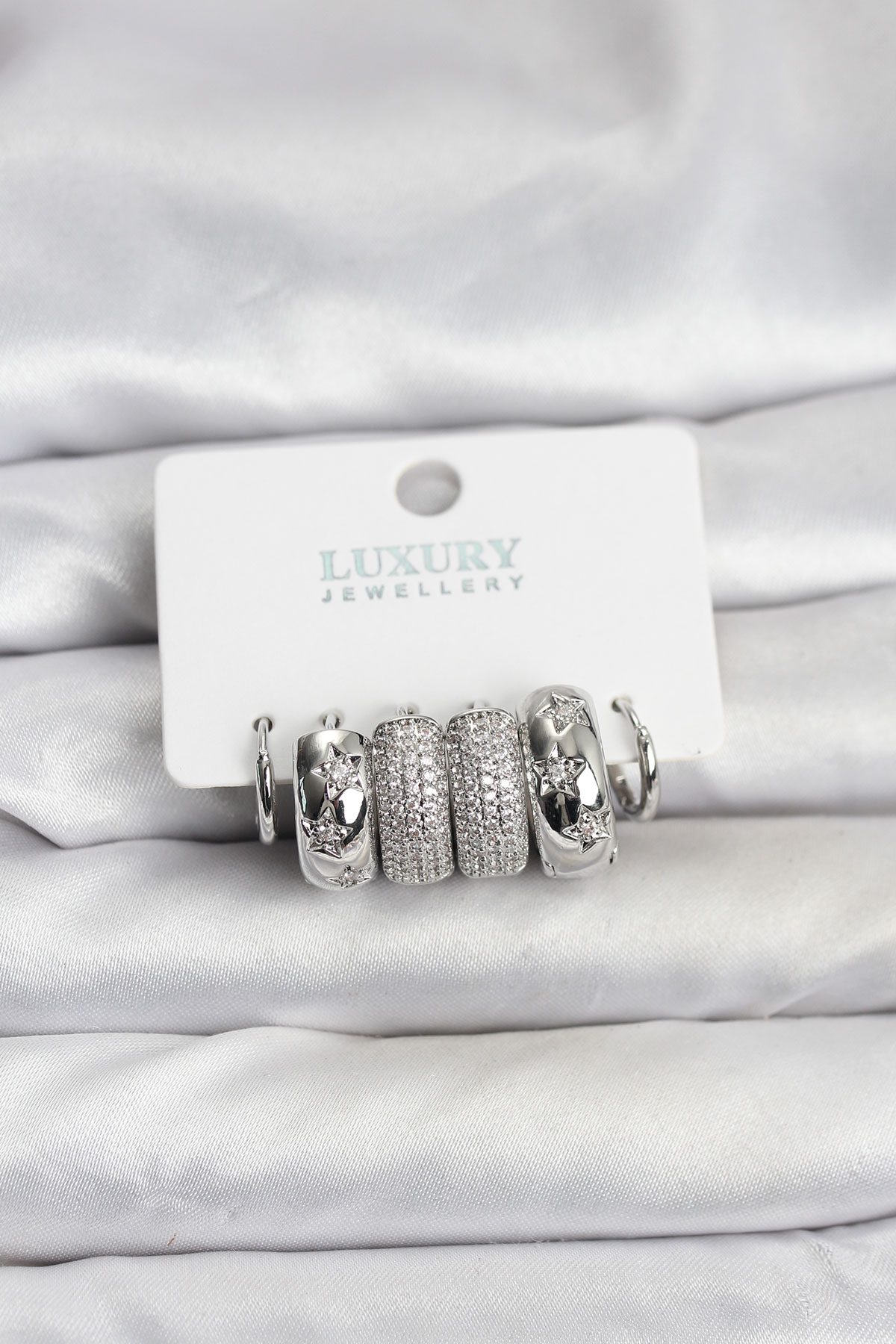 Zirkon Taşlı Pirinç Gümüş Renk Halka Kadın Küpe Seti